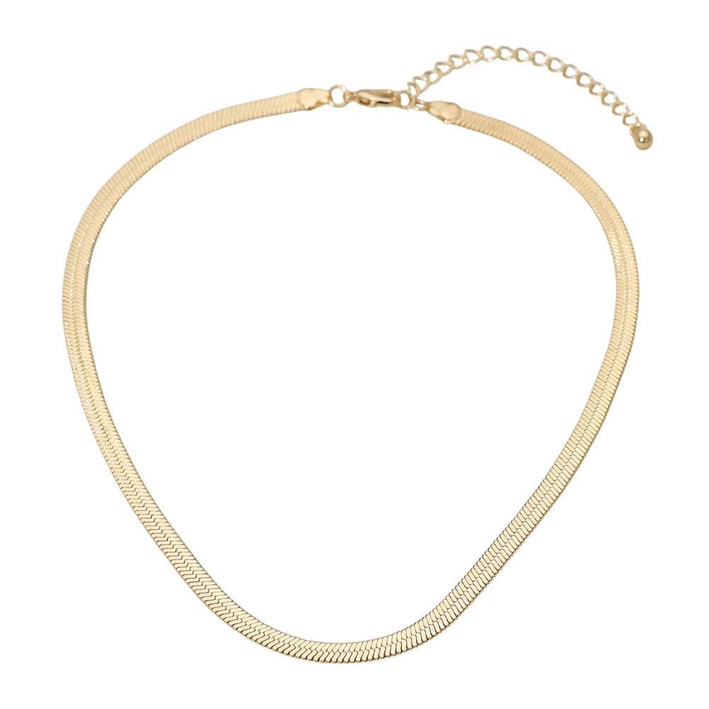 Details • Necklace Size : 19" + 3" L • Decor Size : 0.25" L • Discover effortless sophistication with this herringbone chain necklace, crafted with smooth, flat links that reflect light beautifully. Its sleek and modern design makes it the perfect versatile accessory, ideal for layering or wearing alone to elevate any outfit. • Gold Dipped • Lead and Nickel Compliant