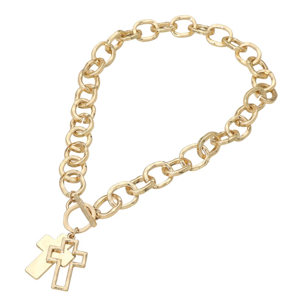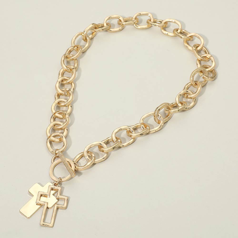 Hammered Layered Cross Pendant Chunky Chain Toggle Necklace