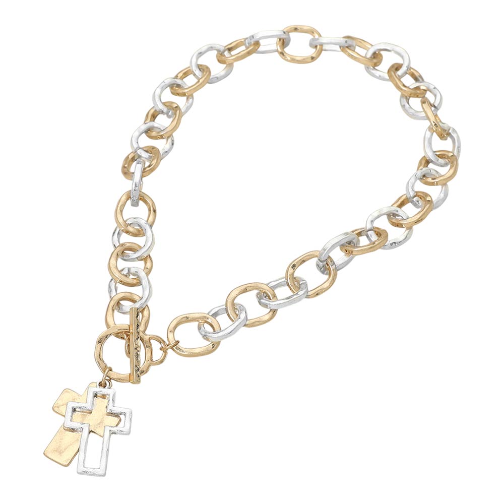 Hammered Layered Cross Pendant Chunky Chain Toggle Necklace