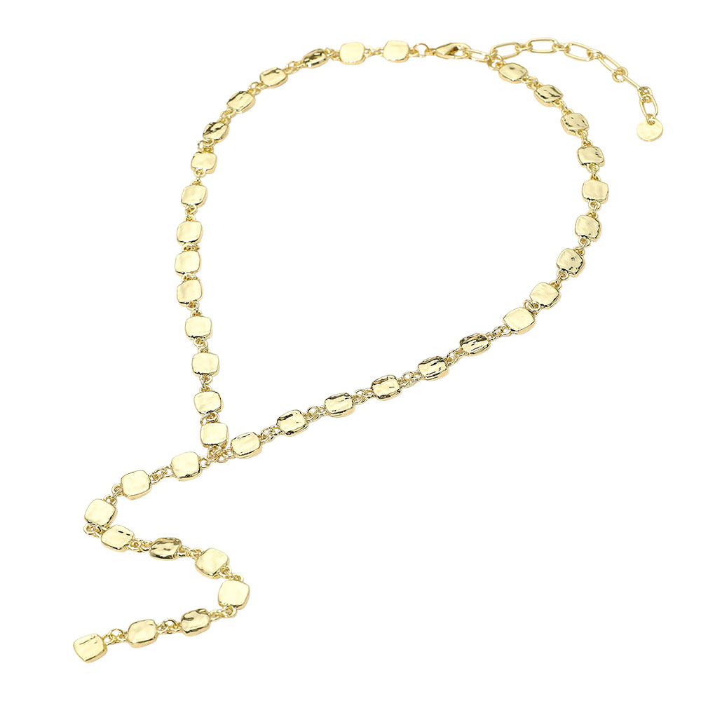 Details • Necklace Size : 18" + 3" L • Decor Size : 5.5" L • Chic Y-shaped necklace featuring a chain of geometric links with a fluid drop design. This versatile piece adds a modern statement to any outfit, ideal for layering or wearing solo to highlight necklines with an elegant, fashion-forward touch. • Lead and Nickel Compliant