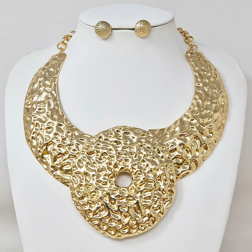 Details • Necklace Size : 19" + 3" L • Decor Size : 3.5" L • Earrings Size : 0.7" L • Elevate your look with this hammered statement collar necklace and matching earrings. Featuring bold, sculpted textures and a striking circular centerpiece, this set exudes modern elegance—perfect for adding a touch of artistic sophistication to any outfit. • Lead and Nickel Compliant