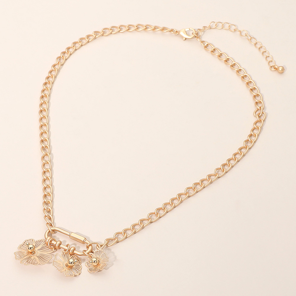 Details • Necklace Size : 16.5" + 3" L • Deor Size : 1.2" L • This floral charm chain necklace showcases delicate flower accents that create soft movement and elegant detail along a refined chain silhouette. Designed to sit comfortably at the neckline, it adds a feminine focal point without feeling heavy. An adjustable extender allows flexible styling at different lengths, making it easy to wear alone for a subtle statement or layer with other necklaces for a polished, everyday look. • Lead and Nickel Compliant