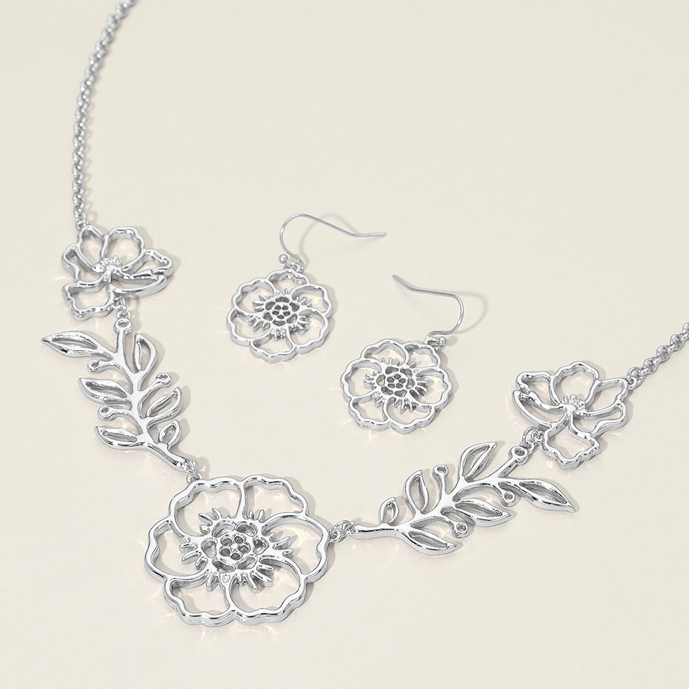 • This floral vine necklace and earring set features sculpted flower motifs connected by flowing leaf details for a graceful, nature-inspired look. Designed for easy coordination, it works well for everyday styling, gifting, boutiques, and seasonal collections, offering a balanced statement that feels elegant yet wearable.