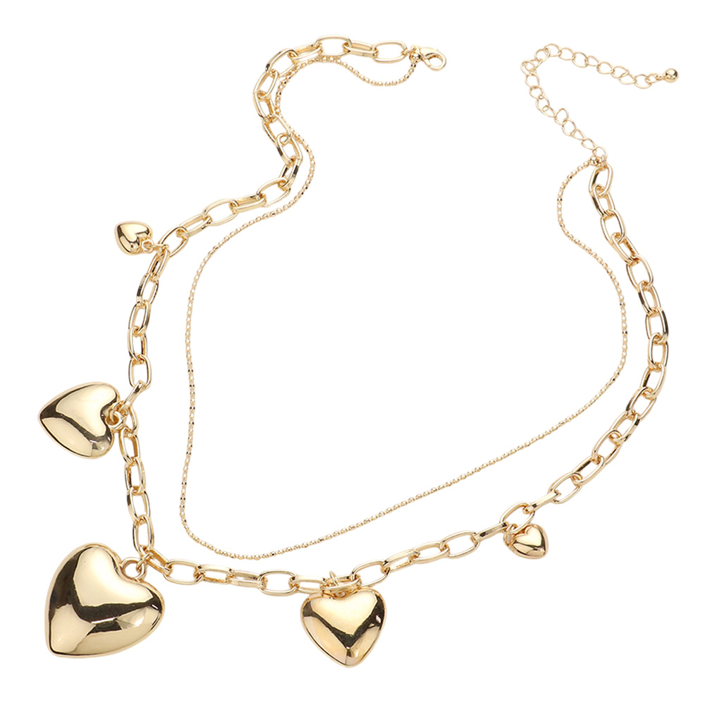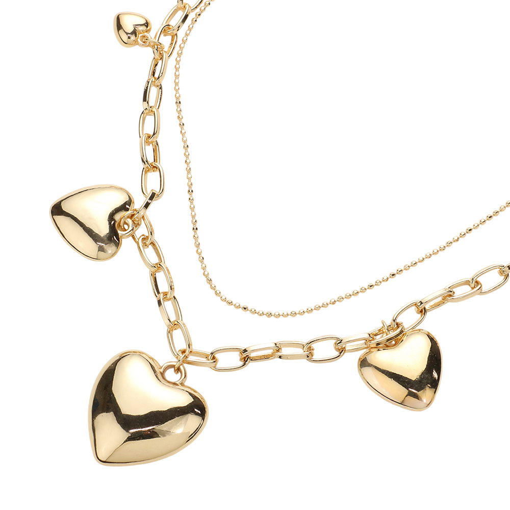 Details • Necklace Size : 16" + 3.5" L • Decor Size : 2.5" L • Charming layered necklace designed with dangling heart accents for a playful yet polished look. Easy to style alone or layered with other pieces, it adds movement and personality to casual and dressy outfits. Ideal for daily wear, gifting, romantic styling, and trend-forward accessory collections. • Lead and Nickel Compliant