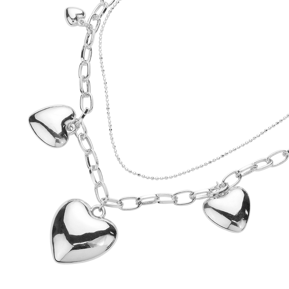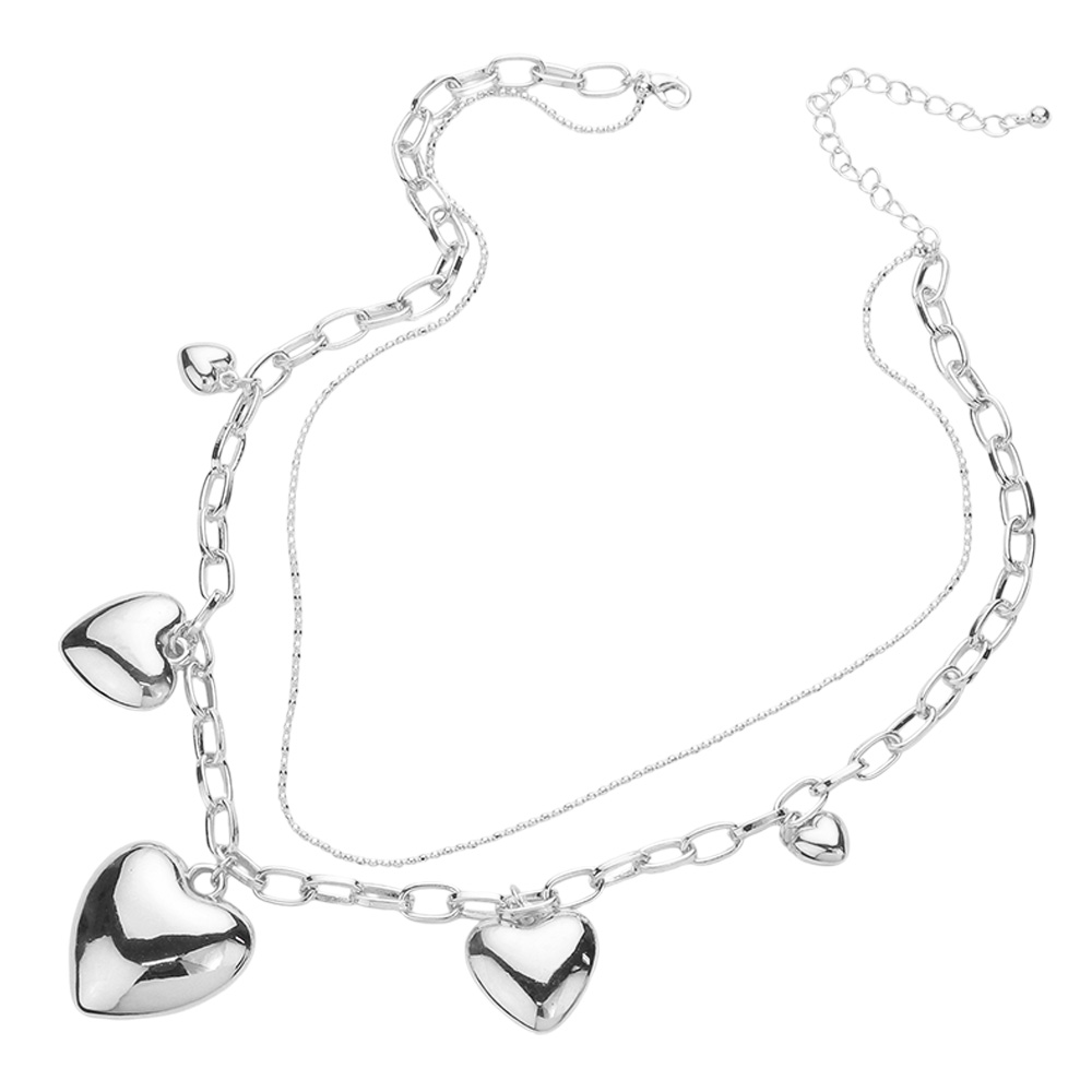 Details • Necklace Size : 16" + 3.5" L • Decor Size : 2.5" L • Charming layered necklace designed with dangling heart accents for a playful yet polished look. Easy to style alone or layered with other pieces, it adds movement and personality to casual and dressy outfits. Ideal for daily wear, gifting, romantic styling, and trend-forward accessory collections. • Lead and Nickel Compliant