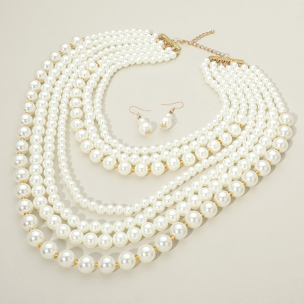 Details • Necklace Size : 16" + 3" L • Decor Size : 7.25" L • Earrings Size : 1.3" L • This multi strand pearl necklace set features layered strands with a graceful drape and coordinating drop earrings for a complete look. Designed to elevate formal outfits, special occasions, weddings, and elegant events. A timeless jewelry set that adds dimension and polish, ideal for boutiques, gift assortments, and statement accessory collections. • Lead and Nickel Compliant