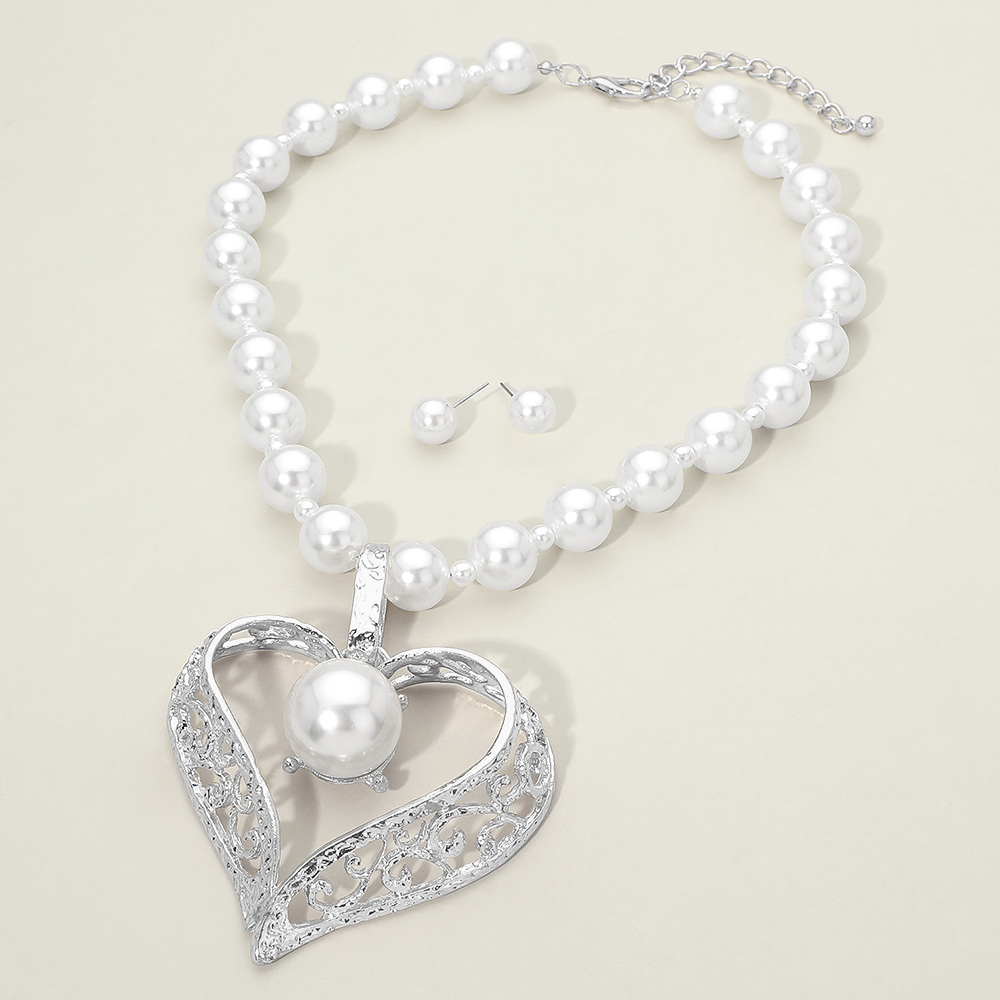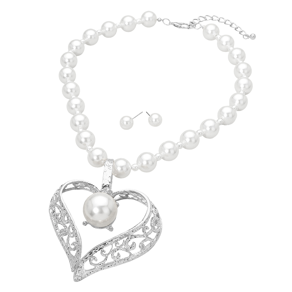 • This pearl necklace set features a classic beaded design highlighted by a heart shaped pendant centerpiece and coordinating stud earrings. Designed for weddings, special occasions, and elegant everyday styling, it adds timeless charm and graceful detail. A versatile jewelry set ideal for boutiques, gifting, and refined accessory collections seeking romantic appeal and polished presentation.