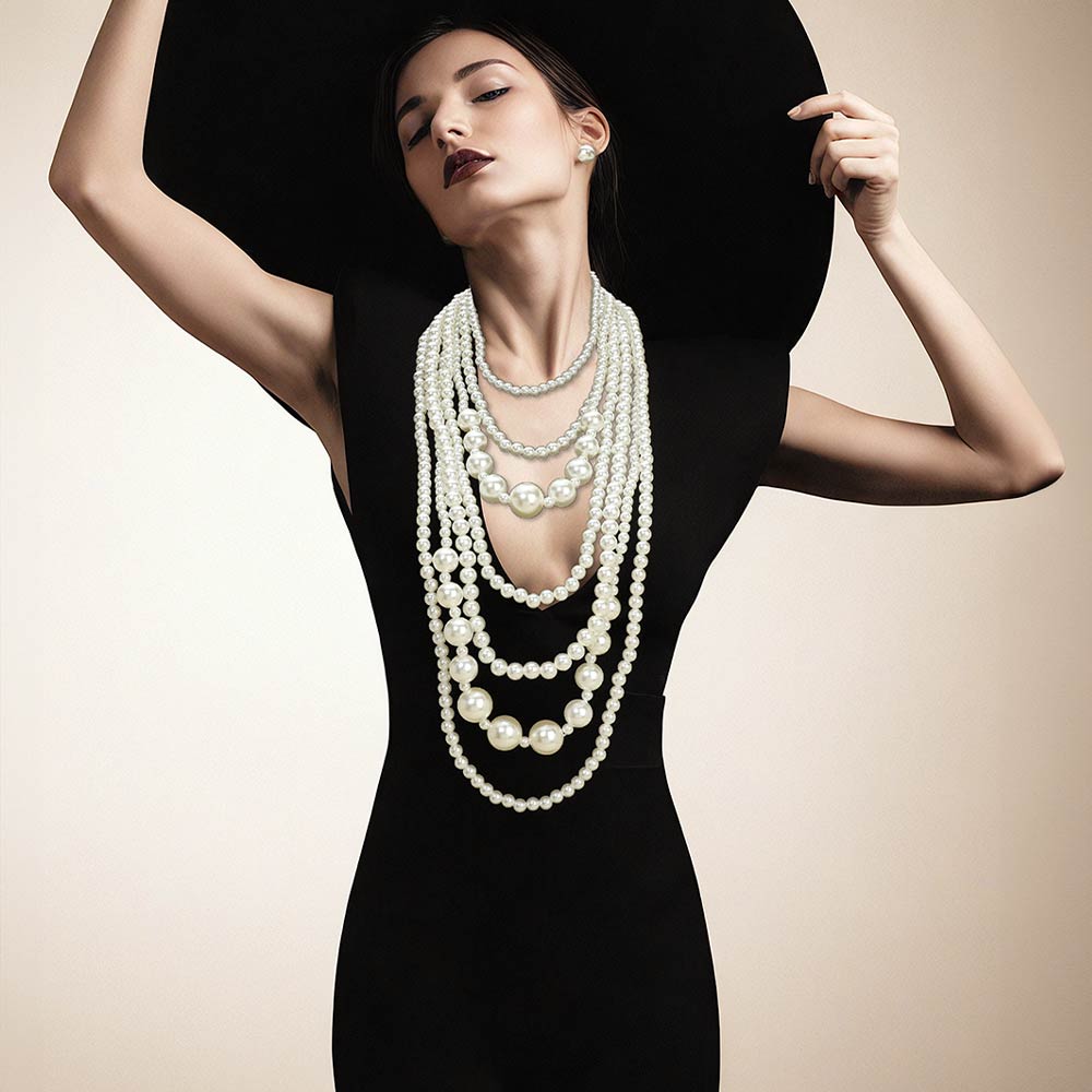 • Elegant layered necklace set designed with multiple pearl strands and graduated bead accents for depth and movement. Drapes beautifully to create a timeless statement look and includes matching stud earrings for effortless coordination. Ideal for formal occasions, bridal styling, or boutiques seeking classic, sophisticated jewelry sets.