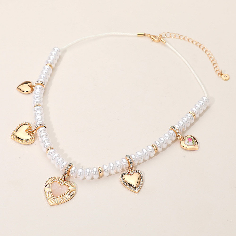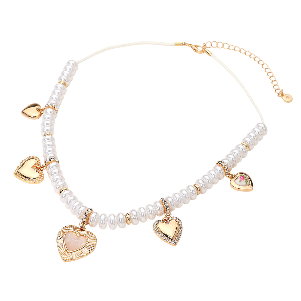 Multi Heart Charm Station Pearl Beaded Necklace Multi Heart Charm Station Pearl Beaded Necklace