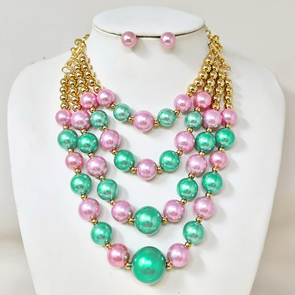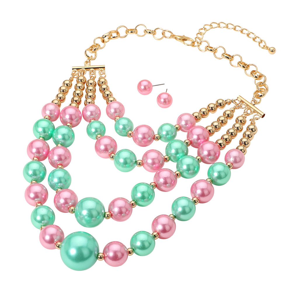 Details • Necklace Size : 15" + 4" L • Decor Size : 4.5" L • Earrings Size : 0.4" L • This multilayer beaded necklace set brings a fun and fashionable touch to any look. Featuring three cascading strands of luminous beads with matching stud earrings, it’s perfect for making a chic statement at parties, events, or casual gatherings with vibrant elegance. • Lead and Nickel Compliant