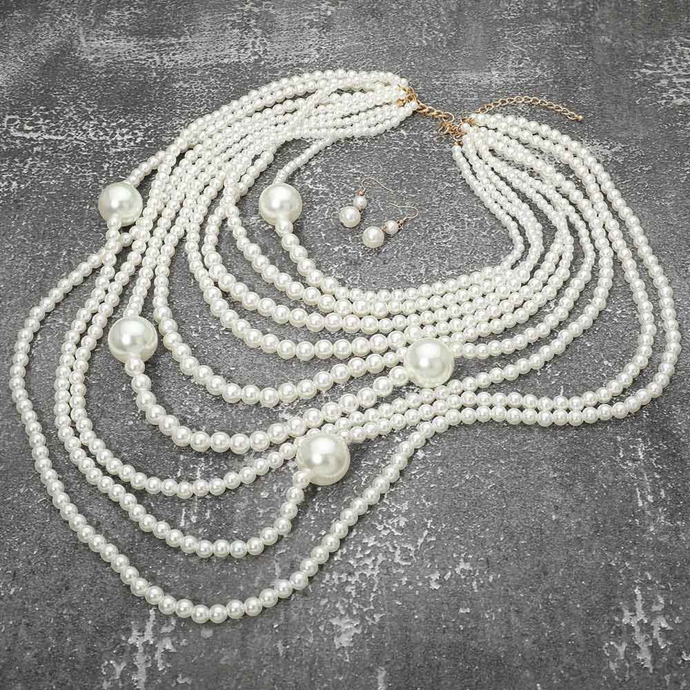 Details • Necklace Size : 20" + 5" L • Decor Size : 12.5" L • Earrings Size : 1.75" L • Elegant multi strand pearl necklace set designed with layered draping and statement bead accents for added dimension and movement. Creates a bold yet timeless look and includes matching drop earrings for coordinated styling. Ideal for formal events, bridal wear, or boutiques seeking classic, elevated jewelry sets. • Lead and Nickel Compliant