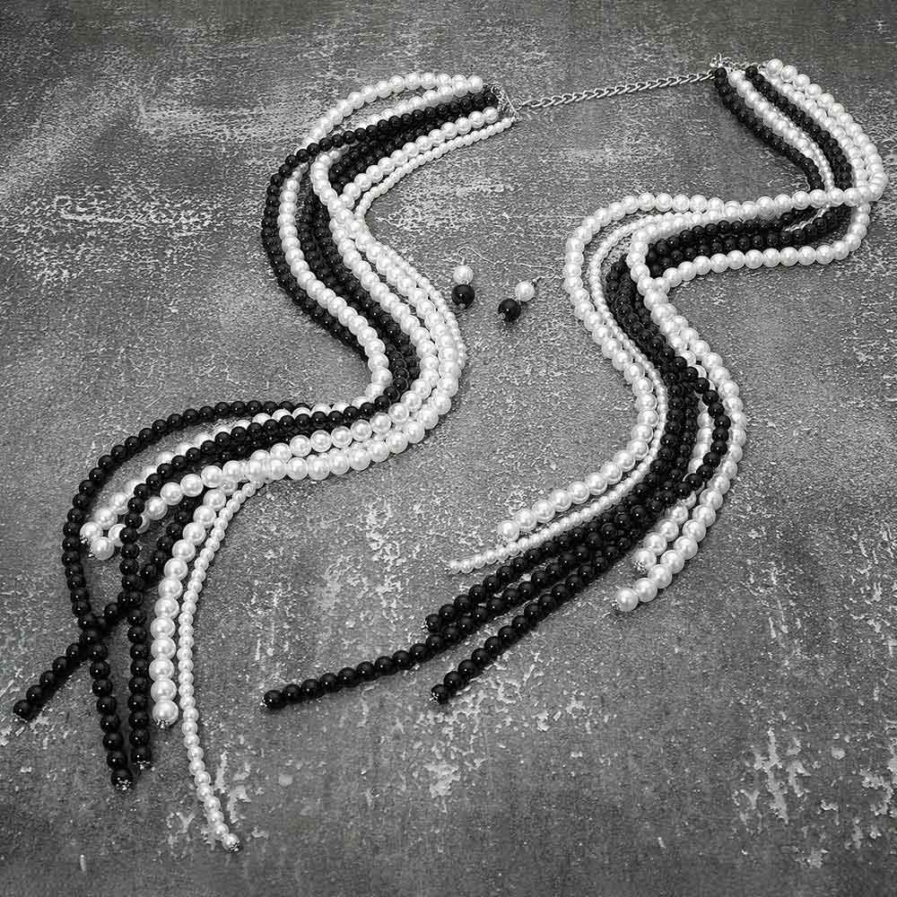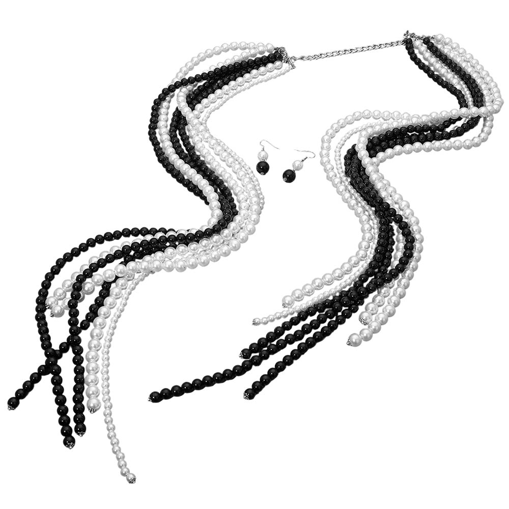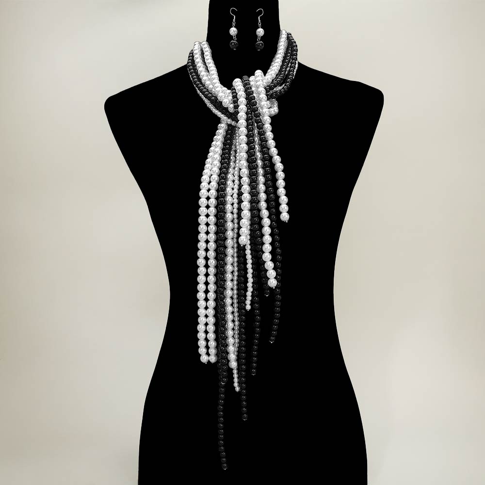 • Elegant multi strand pearl scarf-style necklace designed to drape beautifully with fluid movement and timeless appeal. Features layered strands for a statement look and includes matching drop earrings for coordinated styling. Perfect for formal events, special occasions, or boutiques seeking classic, sophisticated jewelry sets.
