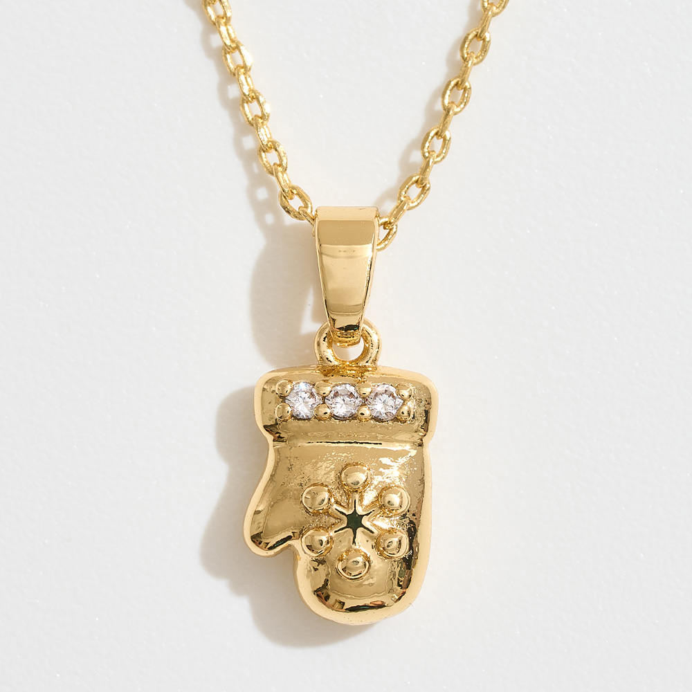 Details • Necklace Size : 16" + 2" L • Pendant Size : 0.3" X 0.7" • Bring warmth and charm to your jewelry collection with this playful holiday mitt pendant necklace. Embellished with sparkling details, it’s the perfect accessory for baking enthusiasts and those who love unique, whimsical designs that express creativity and personality. • CZ Cubic Zirconia • Gold Dipped • Made In Korea