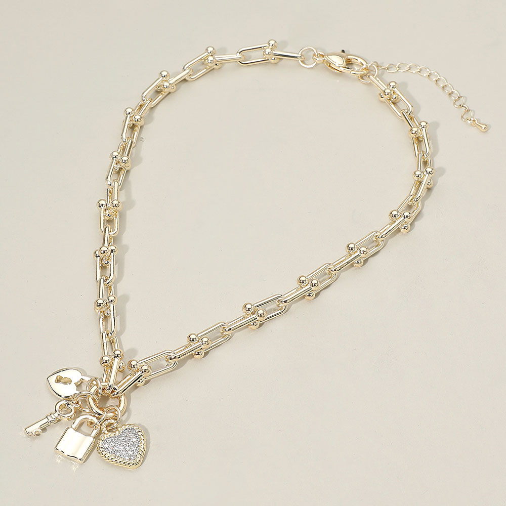 Details • Necklace Size : 17.5" + 2.5" L • Pendant Size : 1.2" X 1.25" • Charming linked chain necklace accented with a key, lock and heart charm cluster and a sparkling pendant detail. Features an adjustable length for versatile styling and adds a playful, statement touch to everyday or special occasion looks. • Gold Dipped • CZ Cubic Zirconia