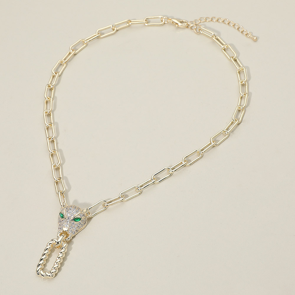 Details • Necklace Size : 17.5" + 2" L • Pendant Size : 0.75" X 2" • Statement chain necklace featuring a bold leopard head pendant with sparkling cz accents and a textured link drop charm. Designed with elongated links for a modern, eye-catching look, this piece adds a striking touch to any outfit and makes a standout accessory for day or night. • Gold Dipped • CZ Cubic Zirconia