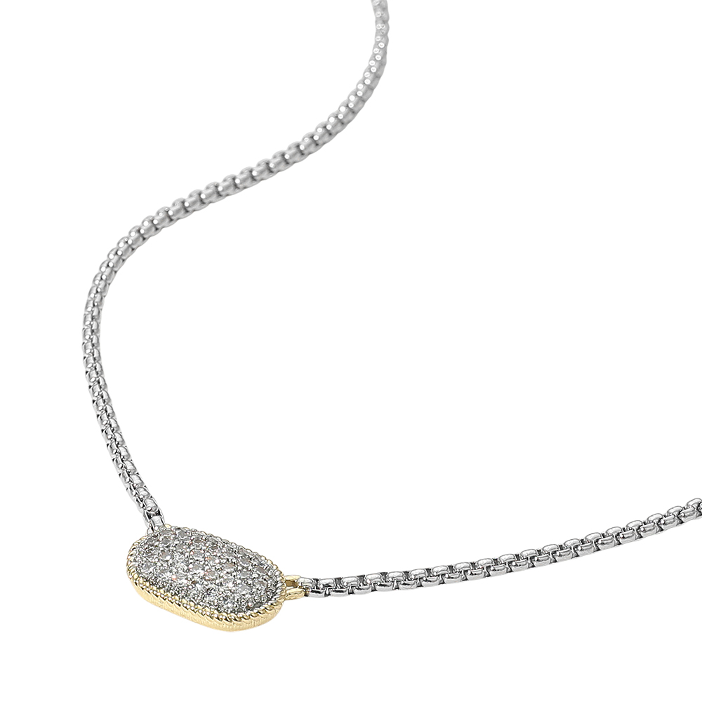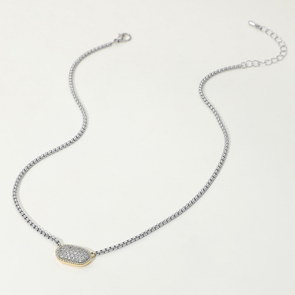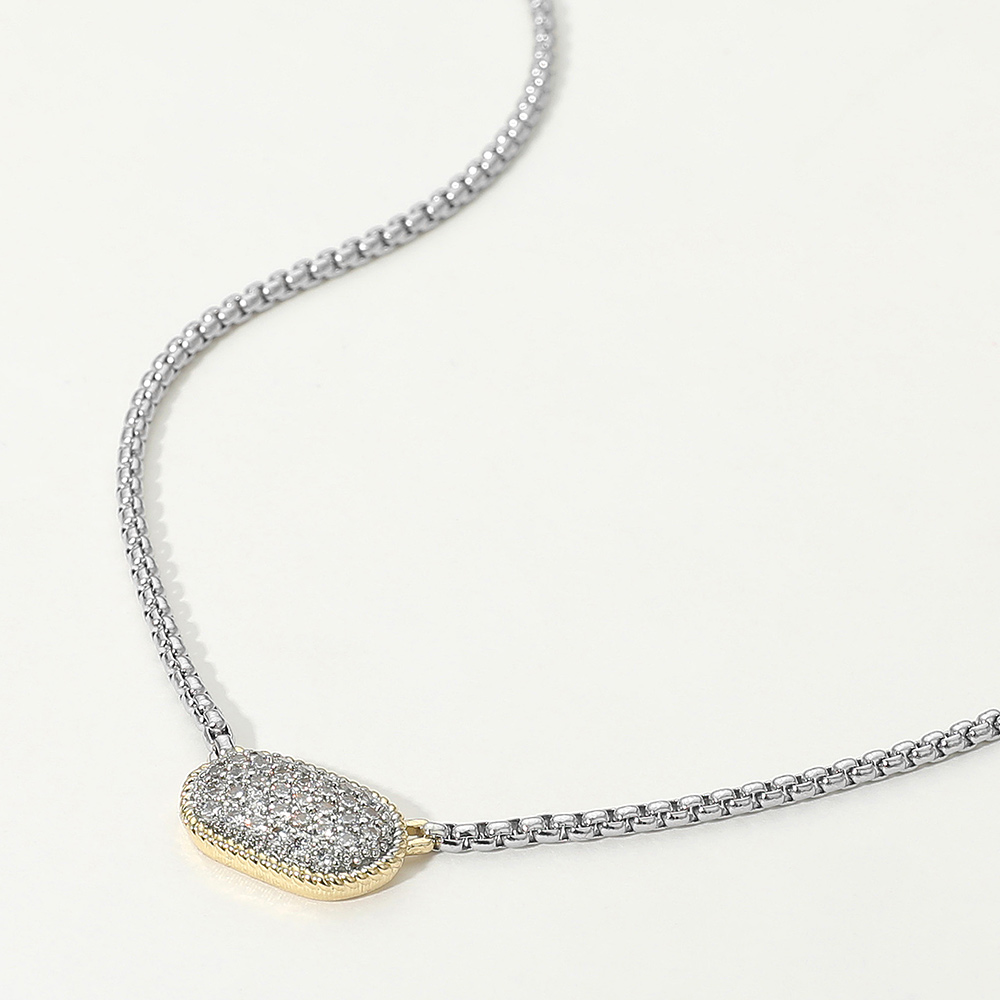 Details • Necklace Size : 17" + 2.25" L • Pendant Size : 0.75" X 0.4" • Add timeless elegance to your collection with this necklace featuring a sleek chain and a pendant encrusted with shimmering accents. Perfect for elevating everyday looks or complementing evening outfits, this piece blends sophistication with modern charm. • CZ Cubic Zirconia • Gold Dipped