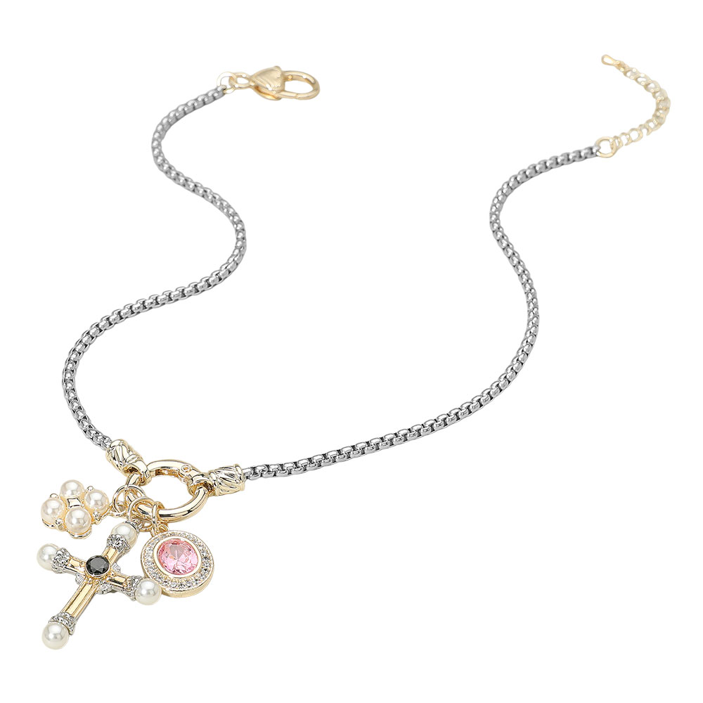Details • Necklace Size : 17.5" + 2" L • Pendant Size : 1.25" X 2.5" • This dual-tone charm necklace combines elegance and symbolism, featuring a radiant cross, pearl cluster, and sparkling pink gem pendant. Designed with a mix of metallic finishes, it adds sophistication and meaning to any outfit, perfect for both casual chic and refined occasions. • CZ Cubic Zirconia • Gold Dipped