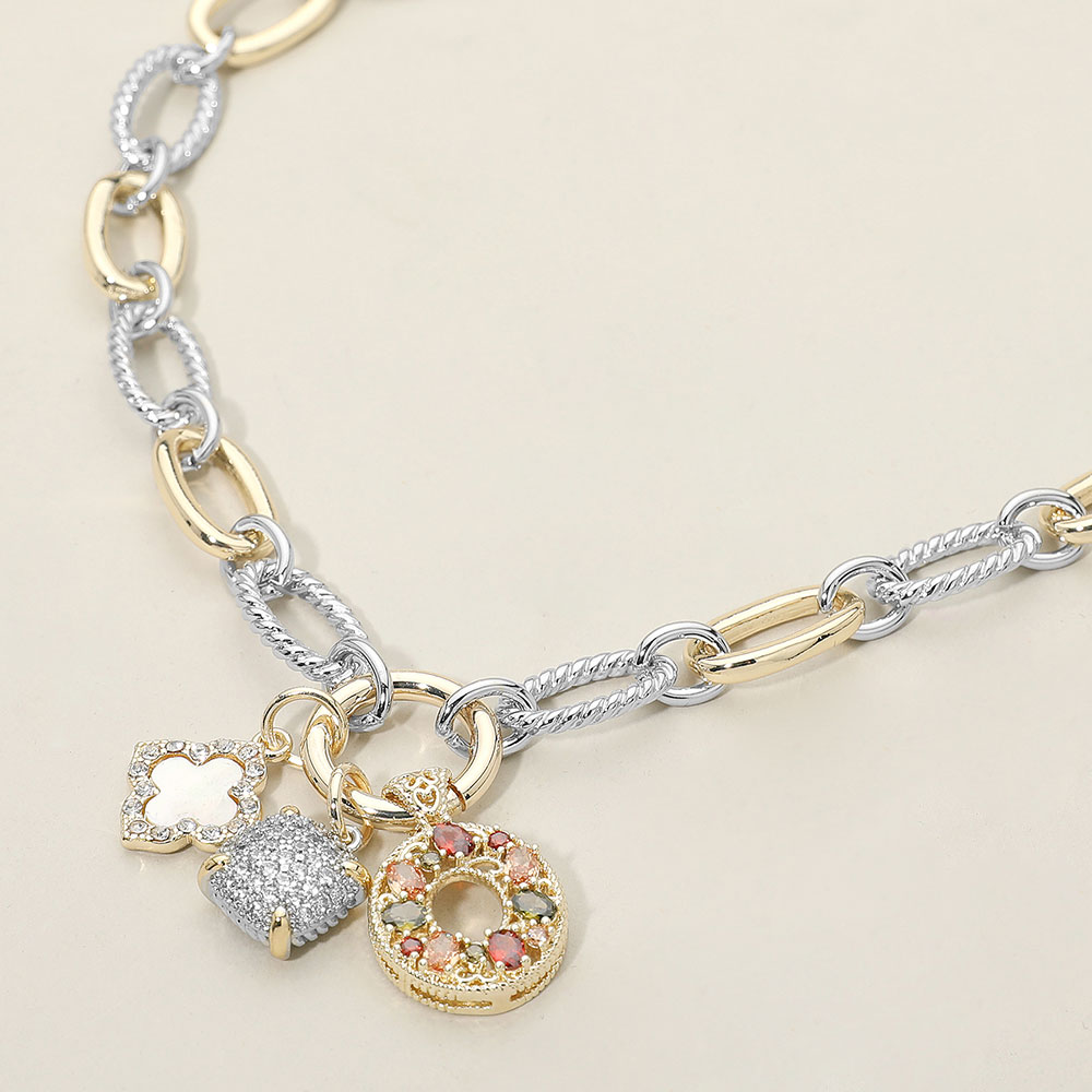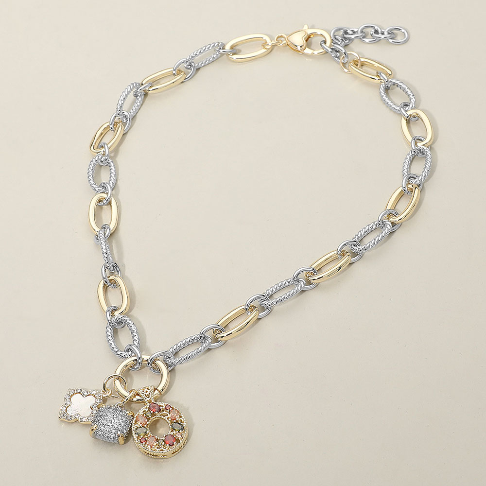 Details • Necklace Size : 17" + 2" L • Pendant Size : 0.7" X 1" • Elevate your style with this two-tone link necklace featuring a mix of textured and smooth chains accented by decorative charms. Its versatile, eye-catching design adds a chic touch to casual or dressy looks, making it perfect for everyday wear or gifting. • CZ Cubic Zirconia • Gold Dipped