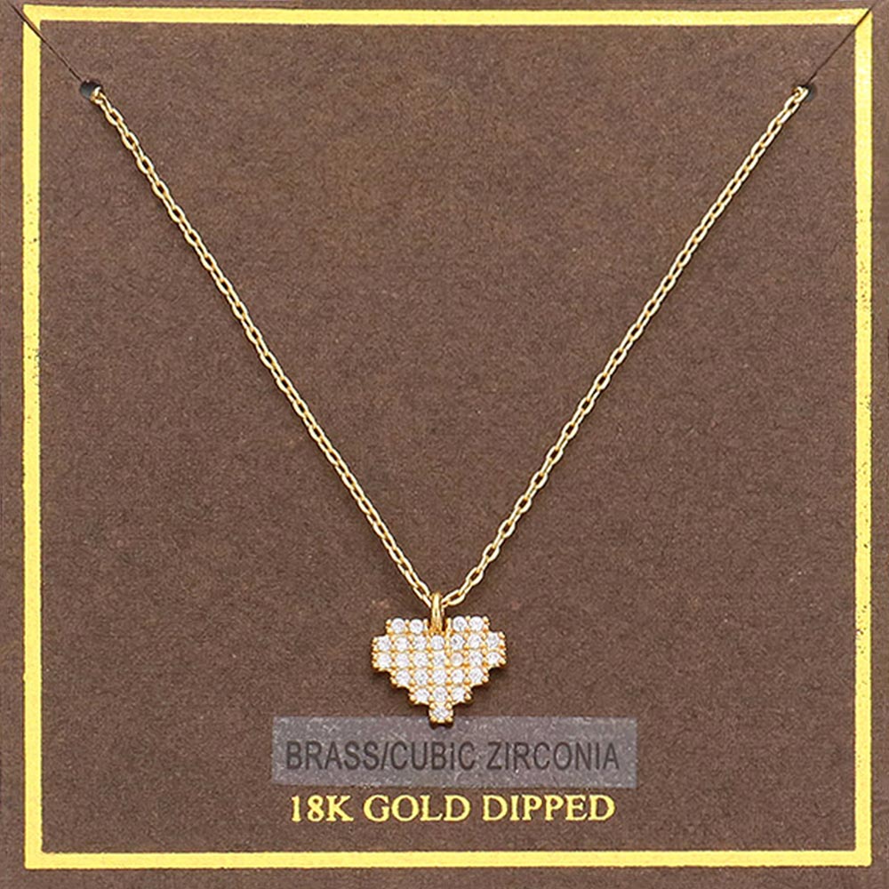 Details • Necklace Size : 15.5" + 3" L • Pendant Size : 0.3" X 0.3" • Chic heart pendant necklace adorned with sparkling cubic zirconia accents for timeless elegance. Designed with a delicate chain and modern style, this necklace is versatile for layering or wearing solo, making it a meaningful gift or an everyday accessory that elevates any outfit effortlessly. • Lead and Nickel Compliant • Gold Dipped • Brass • CZ Cubic Zirconia