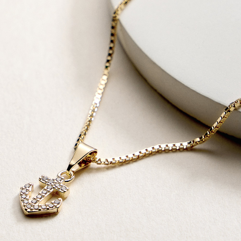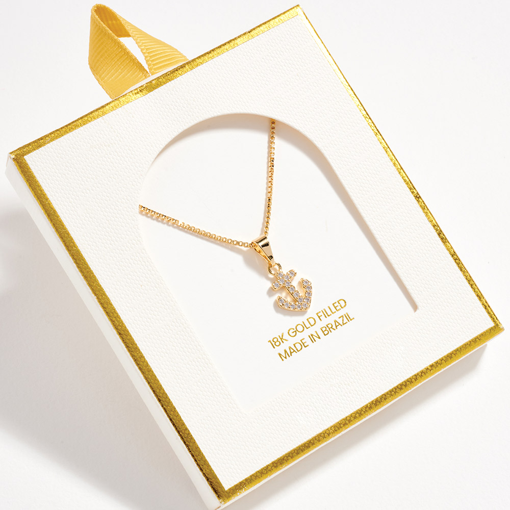 Details • Necklace Size : 18" + 1.75" L • Pendant Size : 0.3" X 0.75" • This anchor charm pendant necklace delivers a timeless nautical touch with a refined silhouette. Designed for everyday wear or vacation styling, it layers effortlessly with other chains or shines on its own. A versatile jewelry piece ideal for coastal themes, gift shops, and trend-driven collections. • CZ Cubic Zirconia • Gold Filled • Hypoallergenic • Lead and Nickel Compliant • Made In Brazil