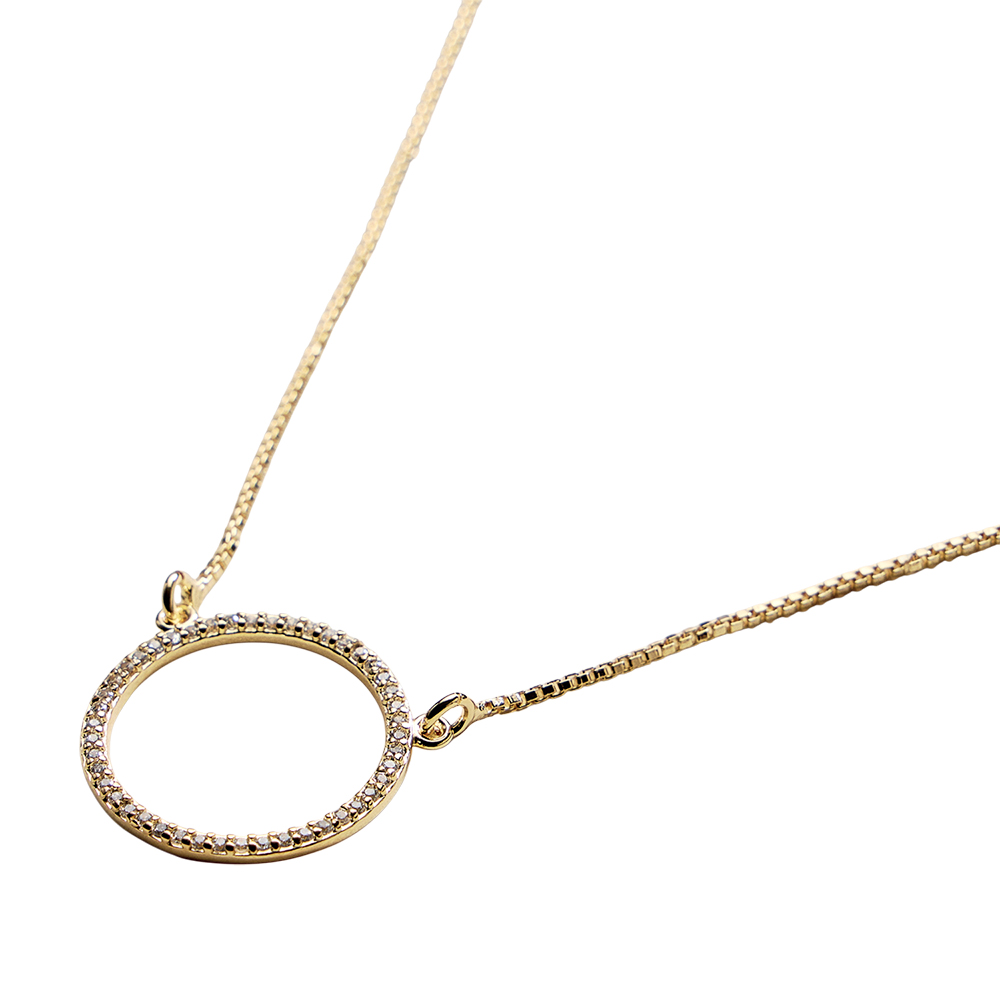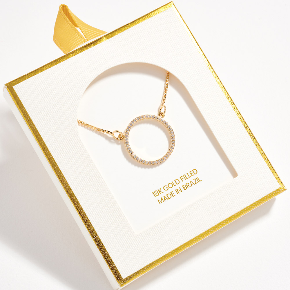 Details • Necklace Size : 18" + 1.75" L • Pendant Size : 0.75" X 0.75" • This circle charm pendant necklace features a clean, timeless silhouette that symbolizes unity, balance, and everyday elegance. Designed for easy layering or solo wear, it complements casual and dressy looks alike. A versatile, gift-ready jewelry piece ideal for boutiques seeking modern, minimalist necklaces with broad customer appeal. • CZ Cubic Zirconia • Gold Filled • Hypoallergenic • Lead and Nickel Compliant • Made In Brazil
