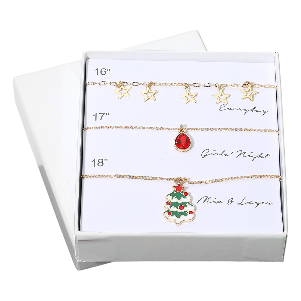 Details • Size 1 : 0.4" L, 16" + 2" L • Size 2 : 0.3" X 0.5, 17" + 2" L • Size 3 : 0.6" X 0.8", 18" + 2" L • Lobster Clasp Closure • Celebrate the season with this three-piece necklace set featuring star charms, a sparkling teardrop pendant, and a festive holiday accent. Designed for layering or wearing solo, this versatile set makes the perfect accessory or thoughtful gift for adding seasonal cheer and elegance. • Lead and Nickel Compliant