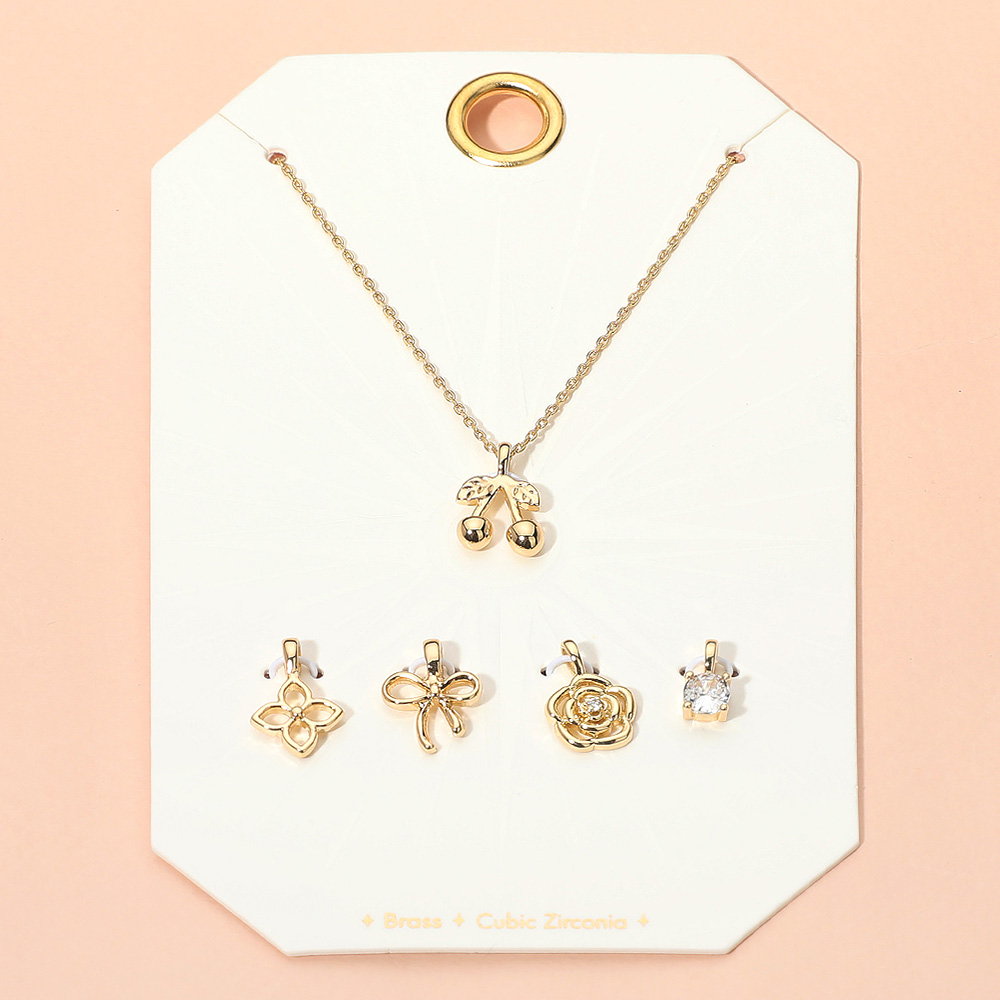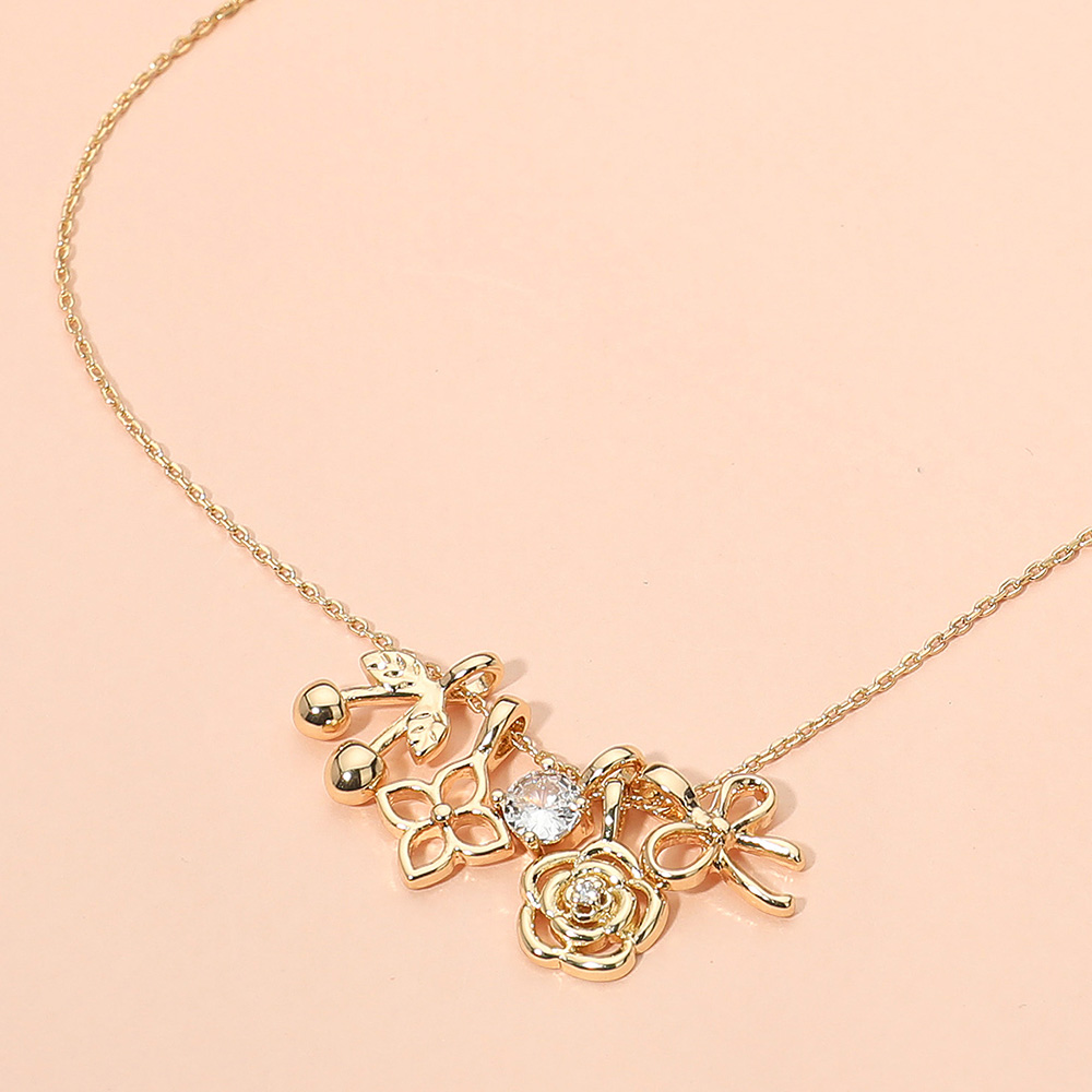 Details • Necklace Size : 15.5" + 2.5" L • Charm Size : 0.3" - 0.5" L • This charm necklace showcases a playful mix of floral, bow, and cherry motifs accented with sparkling details. A versatile piece that blends elegance with whimsy, it adds a unique touch to any outfit. Perfect for layering or wearing solo as a statement accessory. • Brass • CZ Cubic Zirconia • Lead and Nickel Compliant