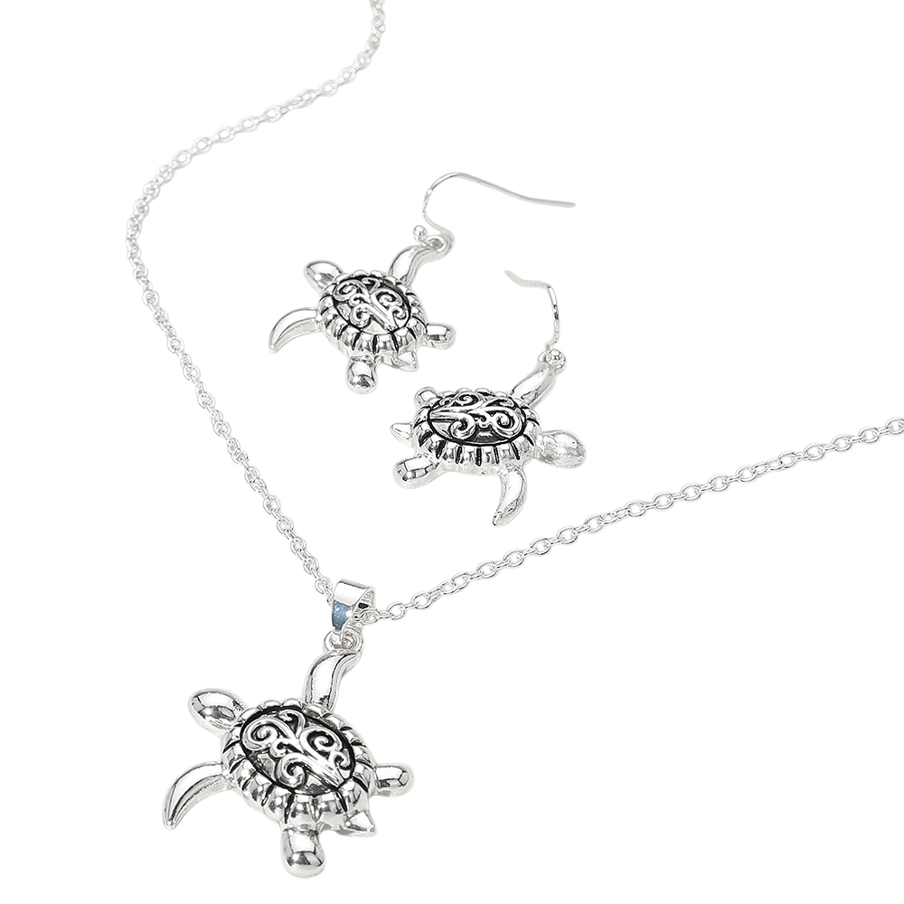 Details • Necklace Size : 18" + 3.25" L • Pendant Size : 1" X 1.5" • Earrings Size : 1.4" L • Adorable sea turtle jewelry set featuring a matching pendant necklace and drop earrings with intricate swirl detailing. Perfect for ocean lovers and those inspired by marine life, this charming accessory adds a whimsical touch to any look and makes a thoughtful gift for any occasion. • Lead and Nickel Compliant