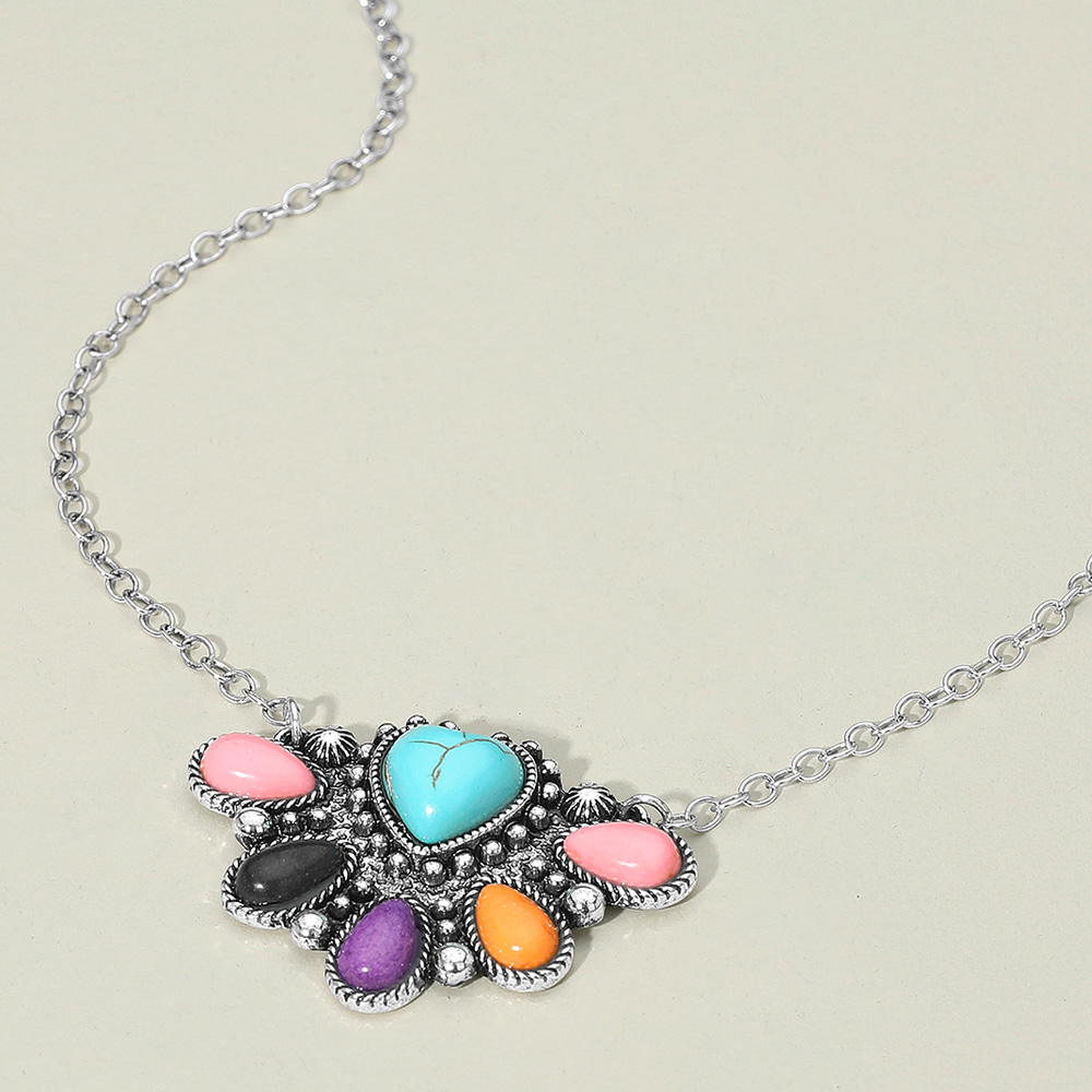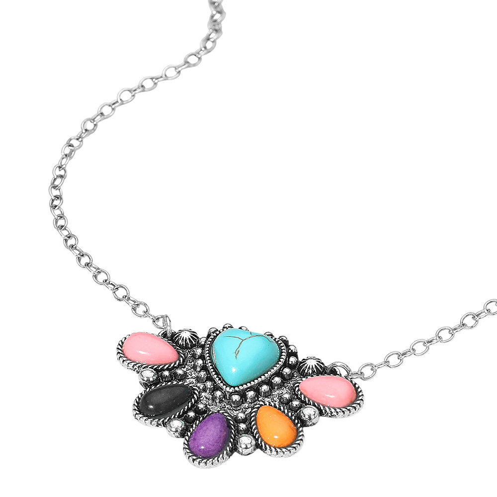 Details • Necklace Size : 18" + 3.5" L • Pendant Size : 1.75" X 1.2" • Make a bold statement with this boho-inspired multi color stone fan necklace featuring teardrop stones and intricate silver-tone detailing. Perfect for Southwestern style lovers, this eye-catching piece adds a vibrant, vintage touch to any outfit. • Lead and Nickel Compliant
