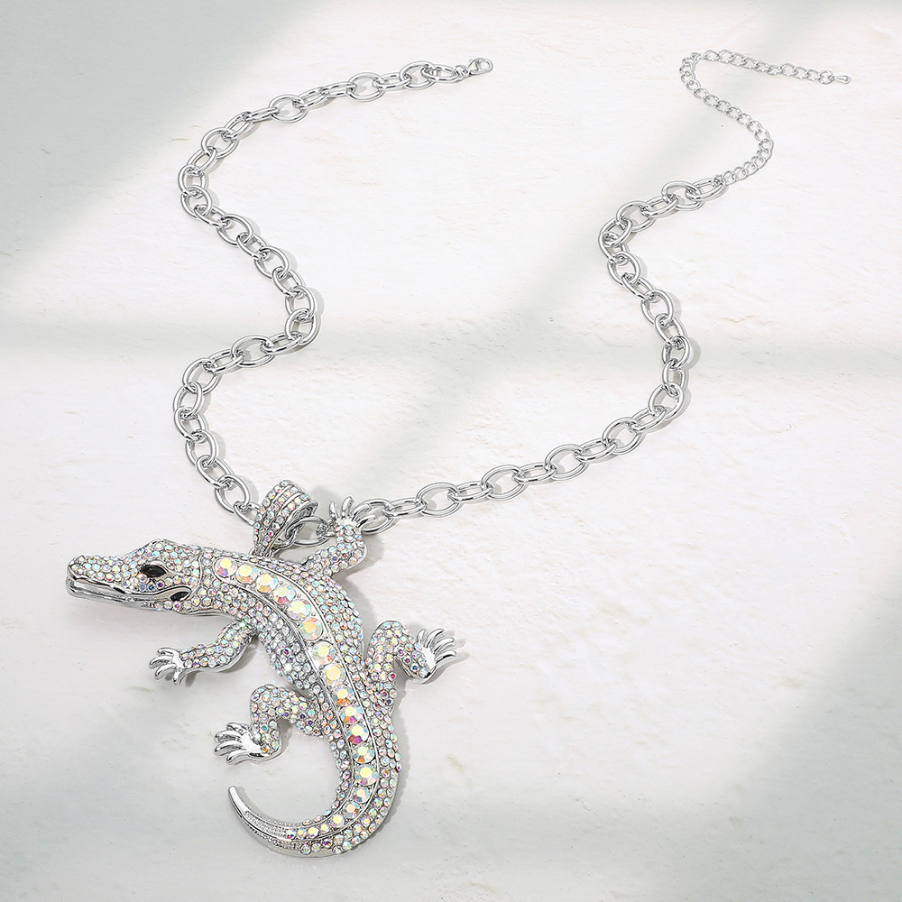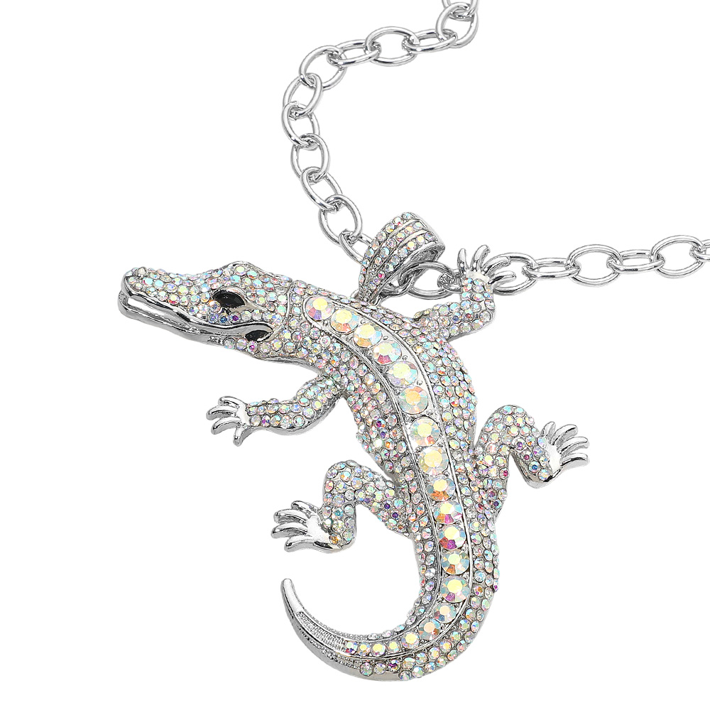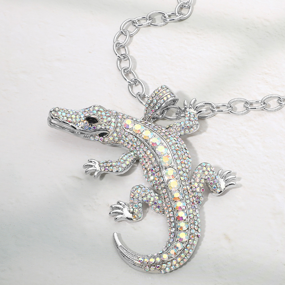 Details • Necklace Size : 22.5" + 5.5" L • Pendant Size : 3.25" X 4.25" • Bold alligator pendant necklace with shimmering accents on a chunky chain. This statement jewelry piece combines edgy charm with artistic flair, perfect for fashion-forward looks or themed events, adding a fierce and captivating touch to any stylish outfit. • Lead and Nickel Compliant
