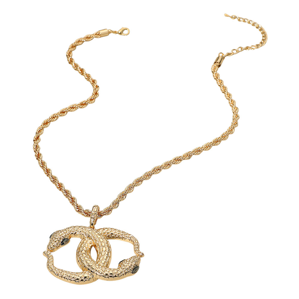 Details • Necklace Size : 18" + 3" L • Pendant Size : 2.3" X 2.2" • Command attention with this interlocking snake pendant necklace, showcasing a unique entwined design that symbolizes strength and transformation. The detailed texture and elegant chain combine to create a striking statement accessory perfect for elevating any fashion-forward look. • Lead and Nickel Compliant