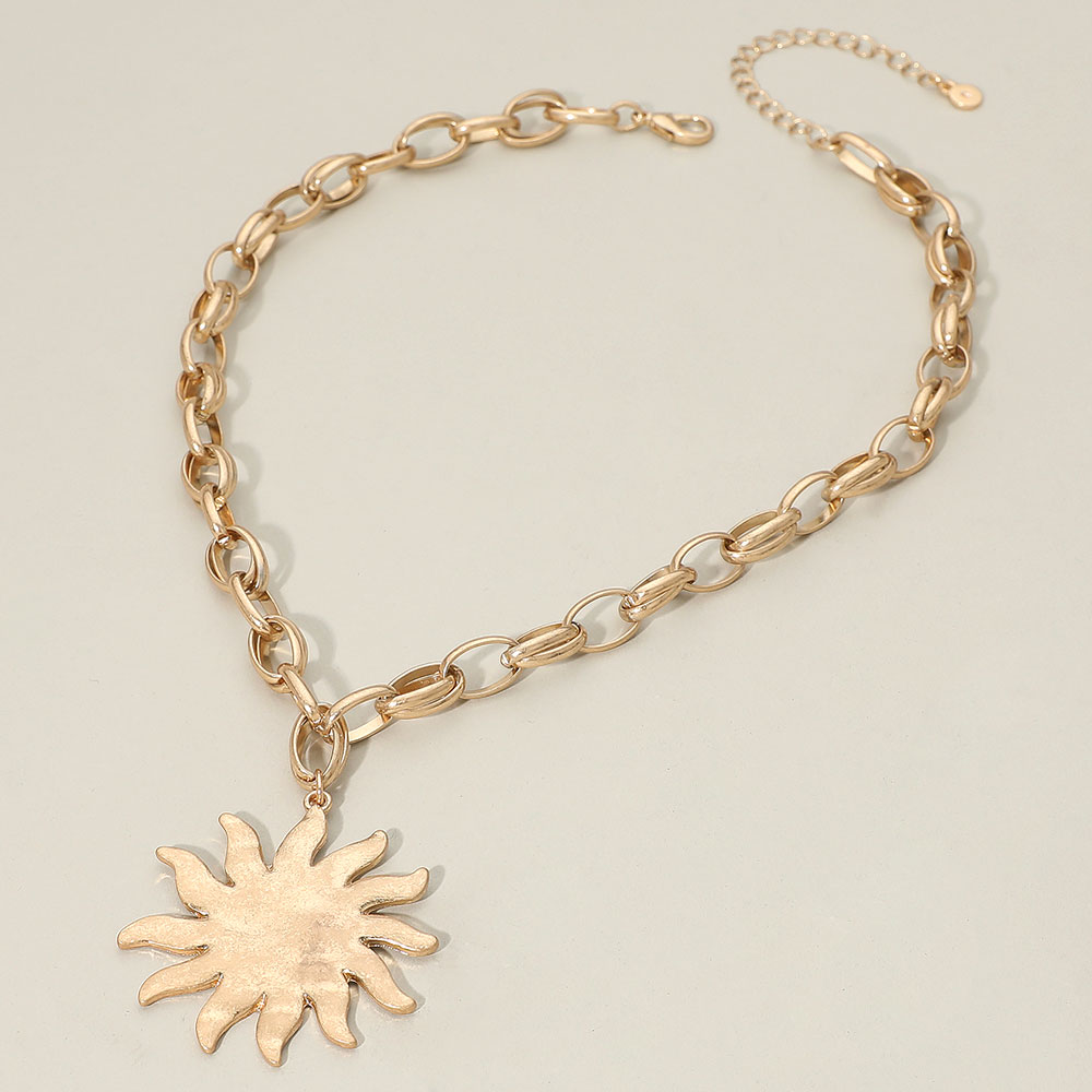 Brushed Metal Sunburst Pendant Chunky Chain Necklace