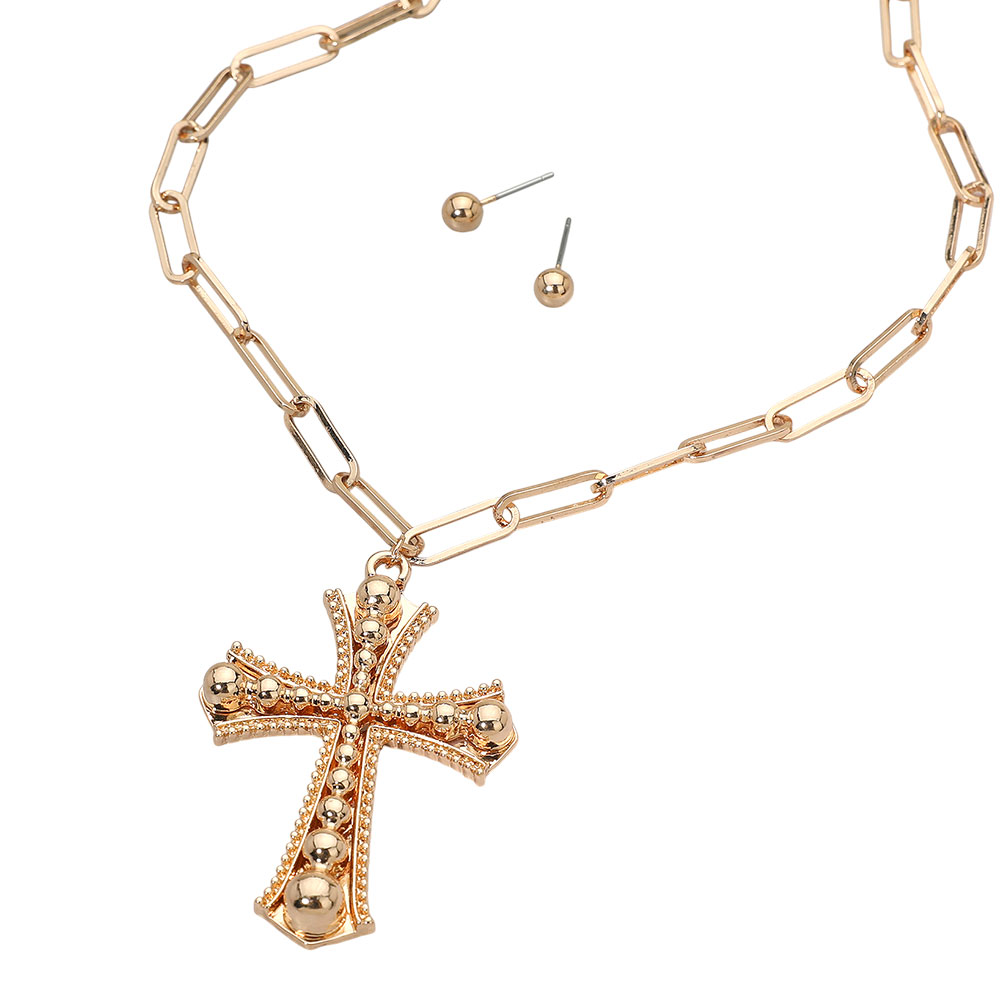 Details • Necklace Size : 17.5" + 2.25" L • Pendant Size : 1.5" X 2.25" • Earrings Size : 0.2" L • Elegant cross pendant necklace set featuring a bold link chain and matching stud earrings. The detailed cross design adds a touch of modern sophistication, perfect for layering or statement wear, making it an ideal accessory for everyday elegance or special occasions. • Lead and Nickel Compliant