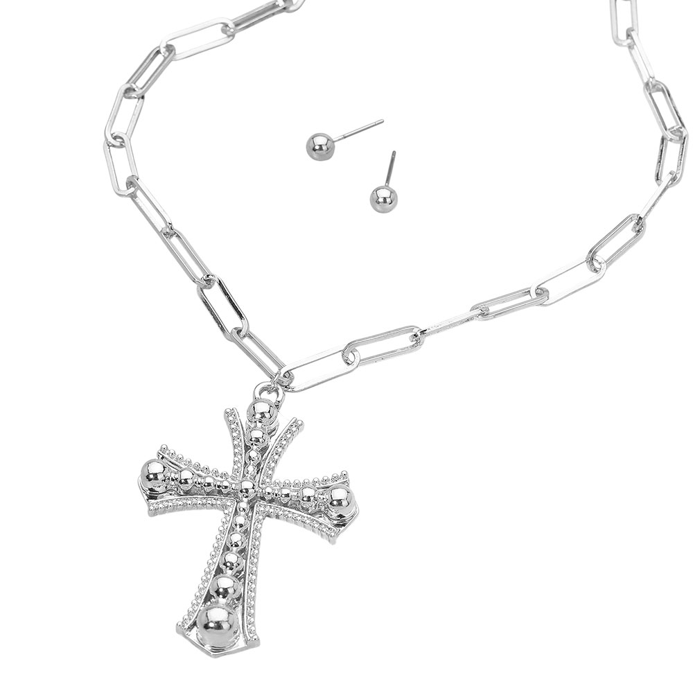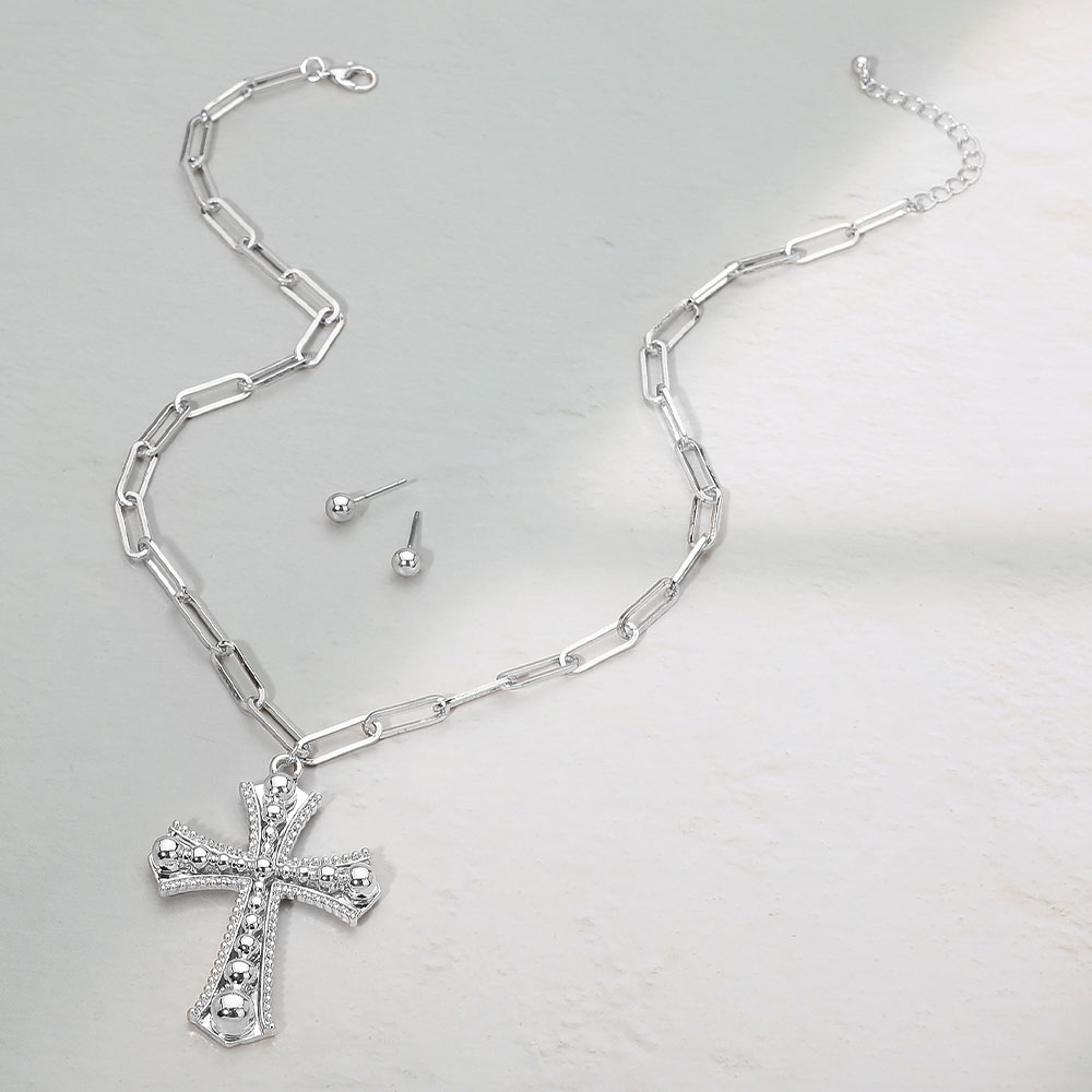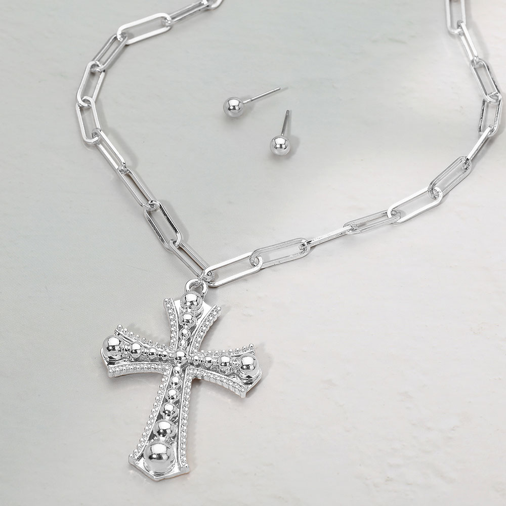 Details • Necklace Size : 17.5" + 2.25" L • Pendant Size : 1.5" X 2.25" • Earrings Size : 0.2" L • Elegant cross pendant necklace set featuring a bold link chain and matching stud earrings. The detailed cross design adds a touch of modern sophistication, perfect for layering or statement wear, making it an ideal accessory for everyday elegance or special occasions. • Lead and Nickel Compliant