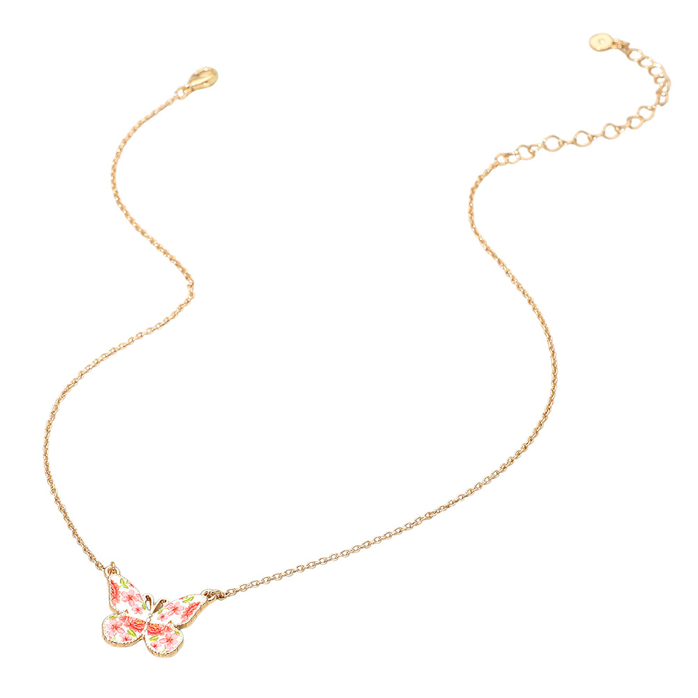 Floral Pattern Enamel Butterfly Pendant Necklace