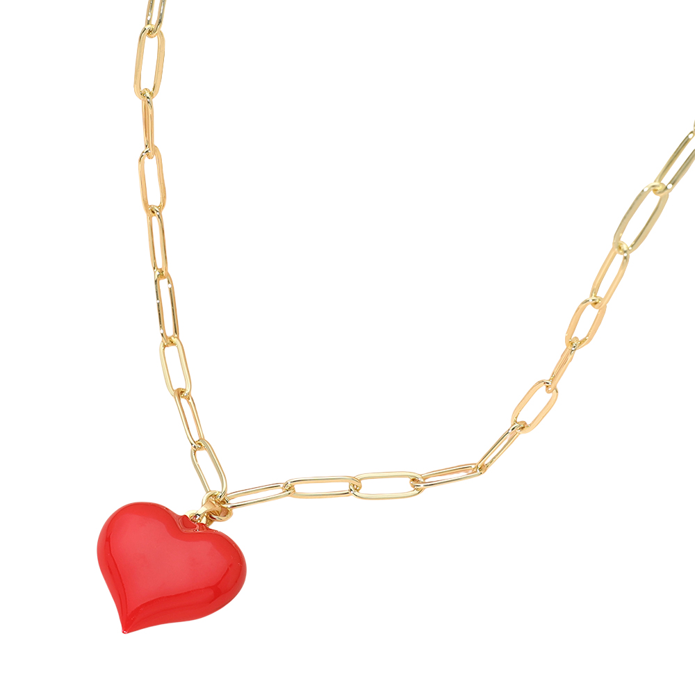 Details • Necklace Size : 15.75" + 2.25" L • Pendant Size : 0.8" X 1.2" • This glossy heart pendant chain necklace showcases a smooth, high-shine heart charm paired with a modern elongated link chain. Designed for statement yet wearable styling, it works beautifully alone or layered, making it a versatile choice for gifting, boutiques, and everyday fashion collections. • Stainless Steel