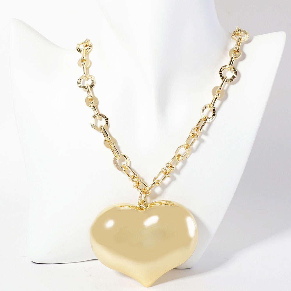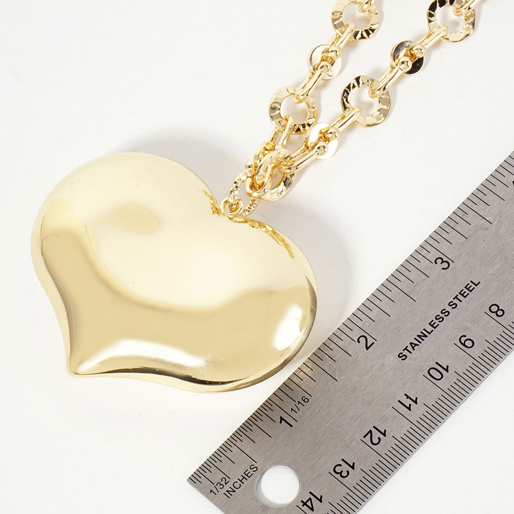 Details • Necklace Size : 18" + 1" L • Pendant Size : 2.75" X 2.25" • Statement heart pendant necklace with sleek chain detailing creates a modern romantic look for everyday or special occasions. Designed to sit beautifully at the neckline, it adds standout shine and effortless elegance to layered or solo jewelry styling. • Gold Dipped • Lead and Nickel Compliant • Made In Korea