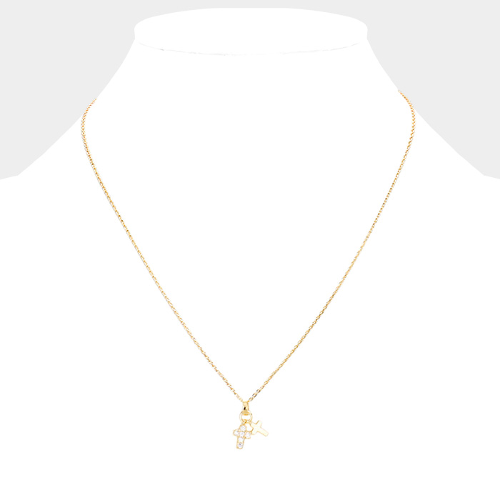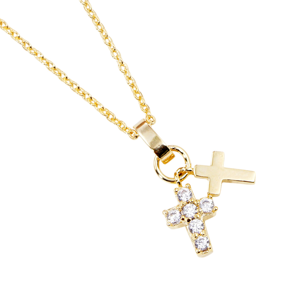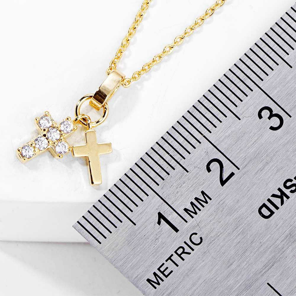 Details • Necklace Size : 15.5"+ 2" L • Pendant size : 0.5" x 0.6" • Elegant double cross pendant necklace featuring one polished cross charm and one crystal-studded cross. A versatile accessory that combines faith and fashion, perfect for layering or wearing solo for a refined look. • Lead and Nickel Compliant • Made In Korea • Gold Dipped • CZ Cubic Zirconia