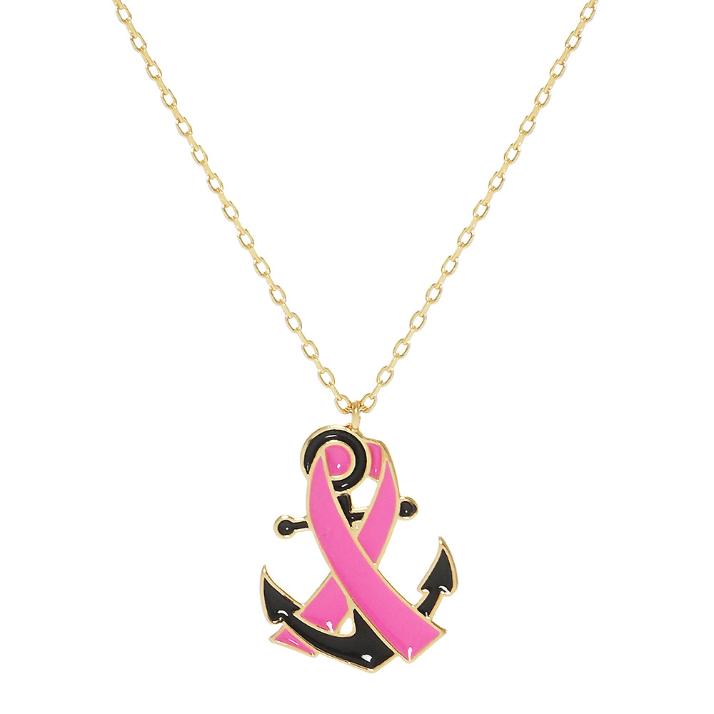 Details • Necklace Size : 15.5" + 2" L • Pendant Size : 0.6" X 0.75" • Show strength and support with this pink ribbon anchor necklace, combining the anchor’s symbol of stability with the ribbon’s message of hope and awareness. A meaningful piece that honors resilience, making it a thoughtful gift or keepsake for courage and love. • Lead and Nickel Compliant • Made In Korea • Gold Dipped