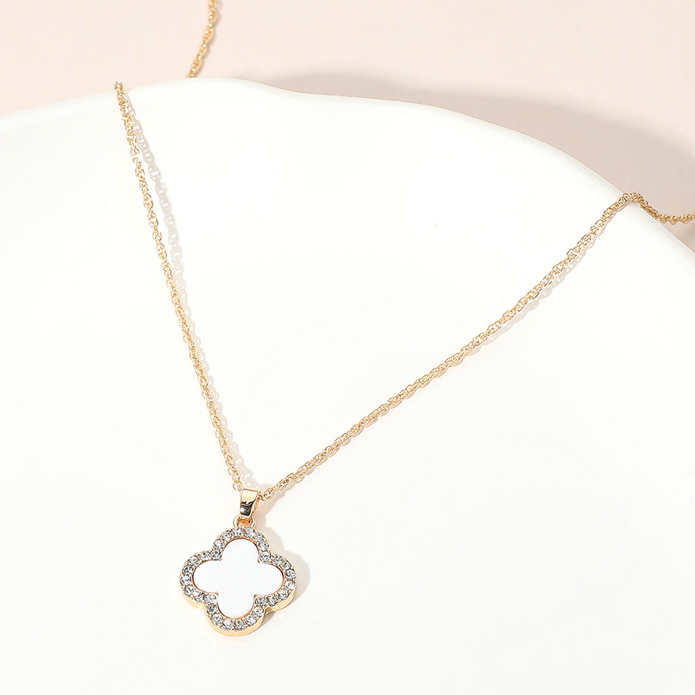 • This radiant quatrefoil outline pendant necklace features a hollow design surrounded by shimmering stones for a touch of elegance. Its delicate chain and timeless silhouette create a versatile accessory that complements both everyday wear and special occasions with effortless charm.