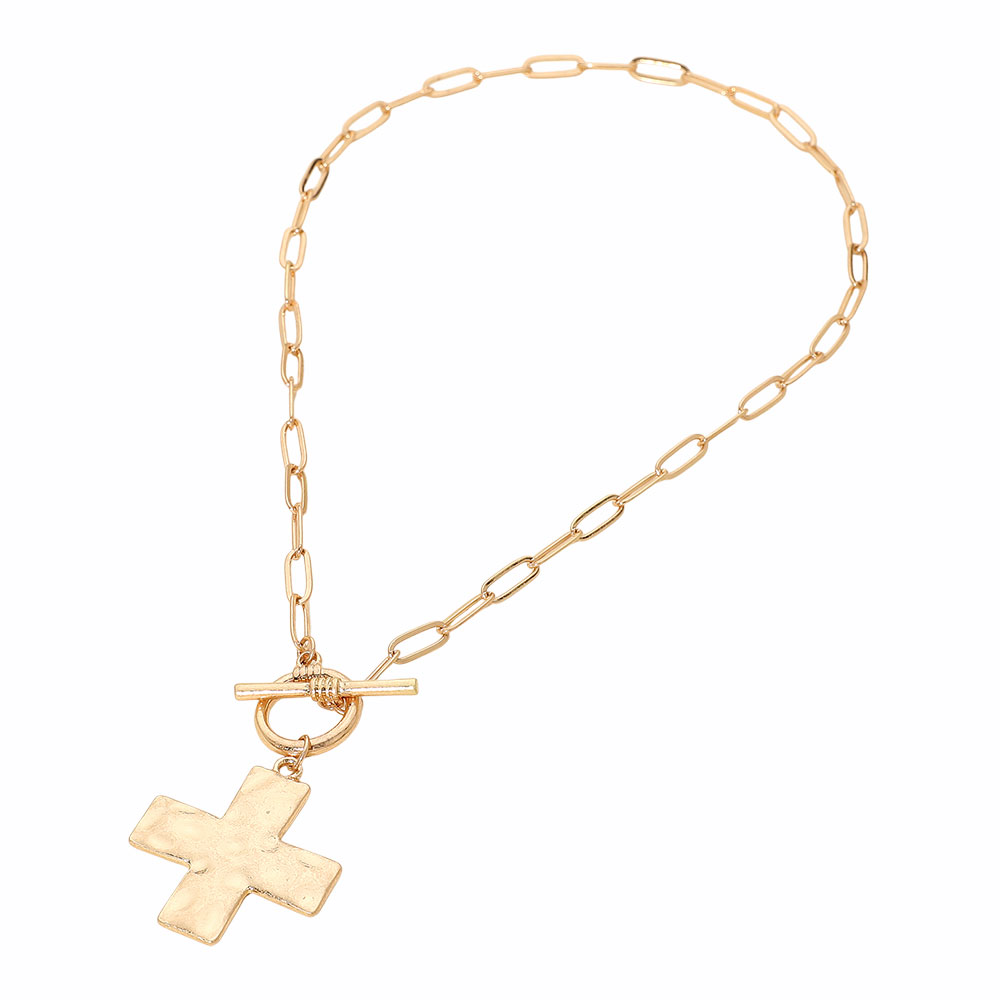 Details • Necklace Size : 17.5" L • Pendant Size : 1.25" X 1.25" • Toggle Closure • Elegant hammered cross pendant necklace with a sleek chain and toggle clasp. Perfect for layering or wearing solo, this modern piece blends timeless symbolism with contemporary design. • Lead and Nickel Compliant