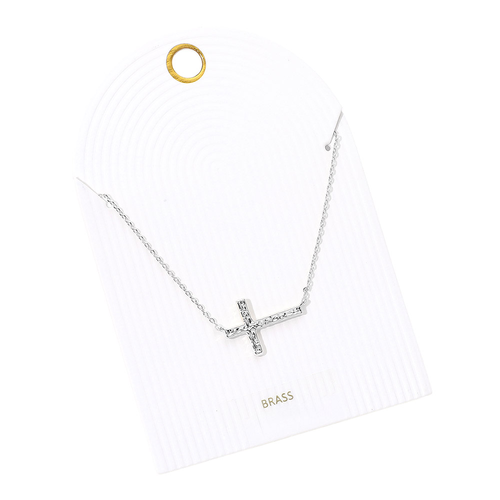 Details • Necklace Size : 15.5" + 3.5" L • Pendant Size : 0.75" X 0.6" • A modern take on a timeless symbol, this sideways cross pendant necklace adds subtle elegance and meaning to any look. Its sleek design and delicate chain make it perfect for layering or wearing alone, offering a refined statement of faith and contemporary sophistication. • Brass • Lead and Nickel Compliant