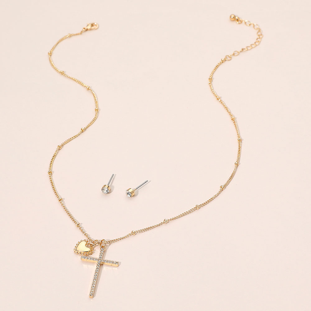 • Add meaningful elegance to your look with this delicate pendant necklace featuring a heart and cross charm, paired with classic stud earrings. Perfect for everyday wear or special moments, this set brings a subtle shine and thoughtful style to any outfit.