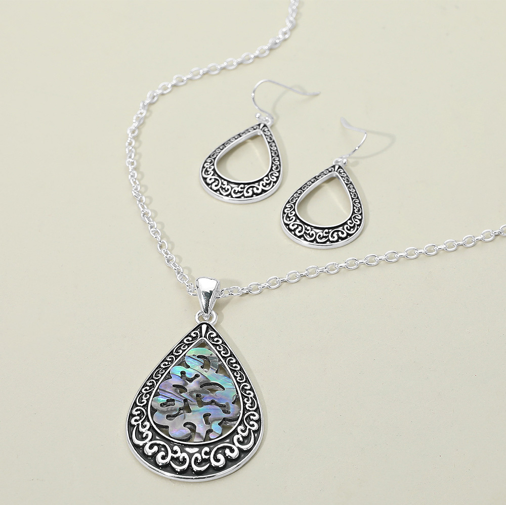 Details • Necklace Size : 18" + 3.5" L • Pendant Size : 1.3" X 2.4" • Earrings Size : 1.6" L • Complete your look with this stunning abalone teardrop pendant and matching earring set. The intricate scrollwork detailing enhances the natural shimmer of the design, creating a sophisticated and eye-catching ensemble perfect for any occasion. • Lead and Nickel Compliant