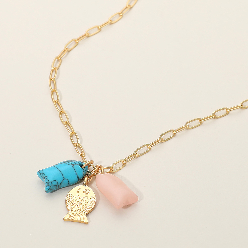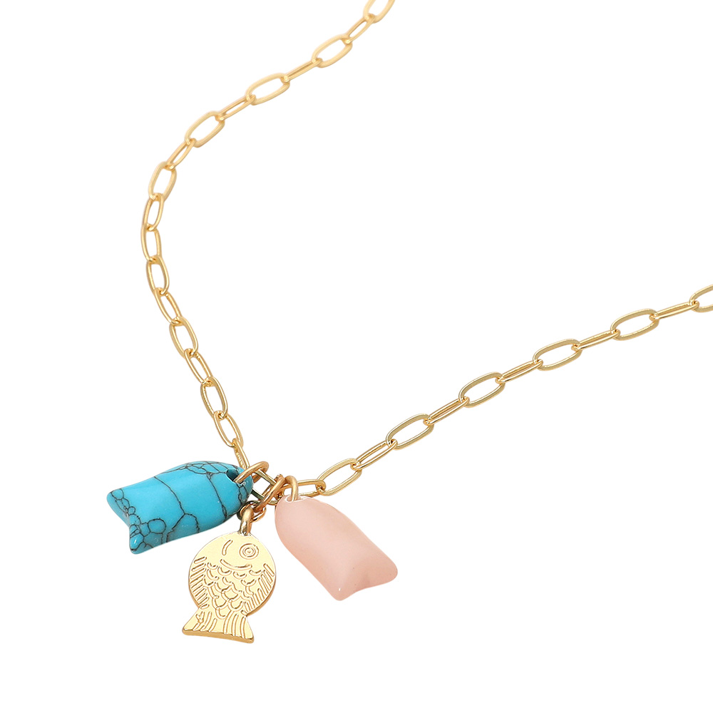 Details • Necklace Size : 16" + 3.5" L • Pendant Size : 1" L • Add a playful touch to your look with this charming pendant necklace featuring a delicate fish charm and colorful gemstone accents. Its bohemian-inspired design blends elegance with whimsy, making it a standout accessory for casual and chic styles. • Lead and Nickel Compliant