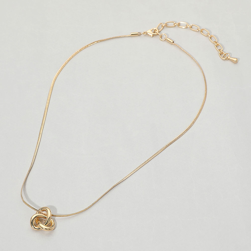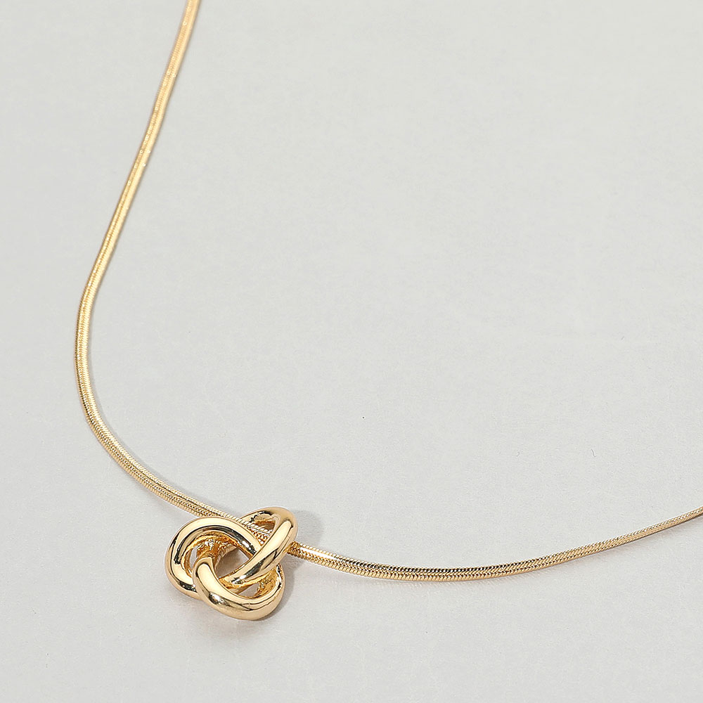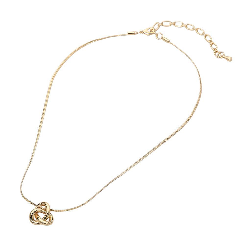 Details • Necklace Size : 16" + 3" L • Pendant Size : 0.6" X 0.7" • Showcase timeless simplicity with this elegant knot pendant necklace. The delicate chain and interlocking design offer a refined look that pairs beautifully with both casual and formal ensembles. • Brass • Lead and Nickel Compliant
