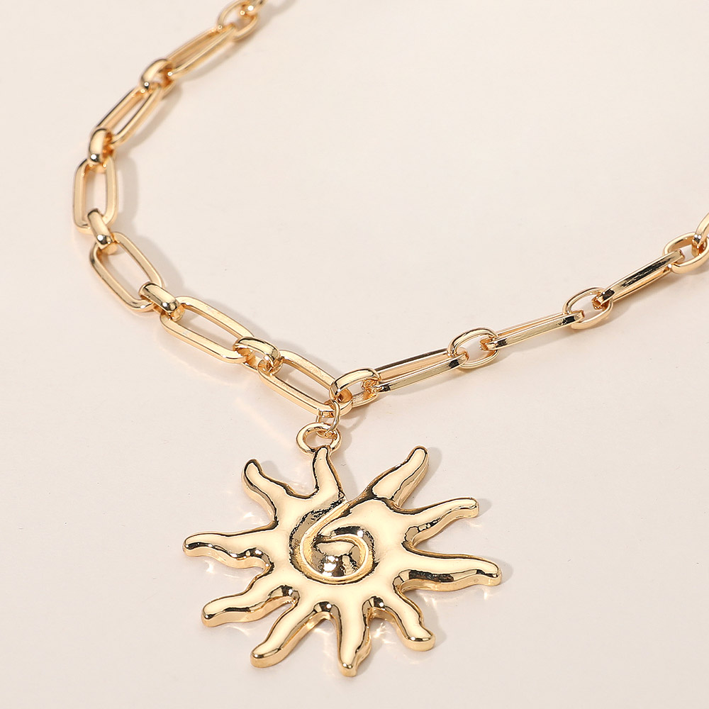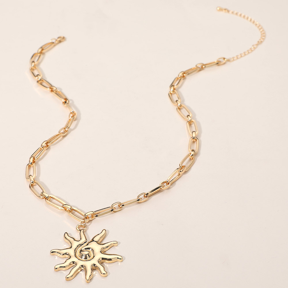 Details • Necklace Size : 16" + 3.5" L • Pendant Size : 1.5" X 1.7" • Radiate positivity with this stunning sunburst charm chain necklace. Featuring a bold spiral sun pendant on a modern link chain, it embodies warmth and energy in every detail. A chic statement accessory that complements casual and dressy outfits with effortless elegance and shine. • Lead and Nickel Compliant