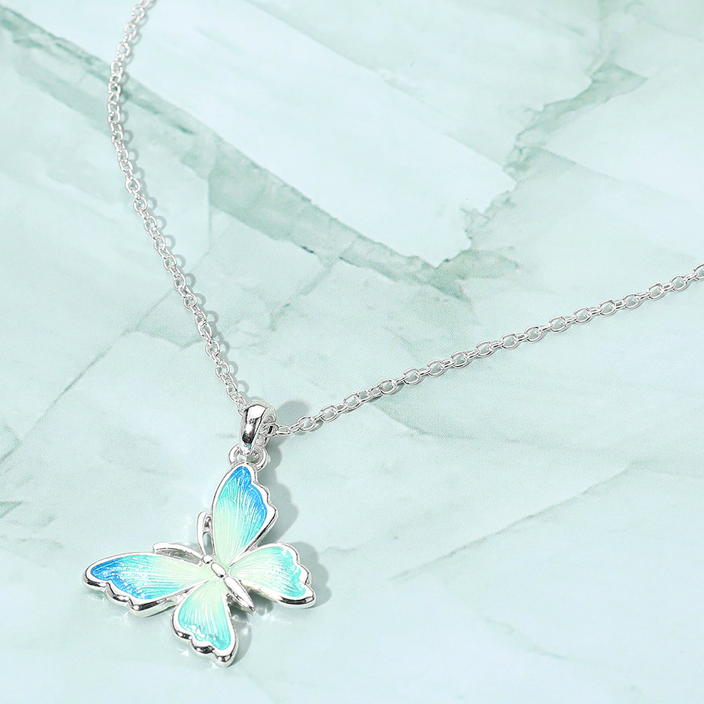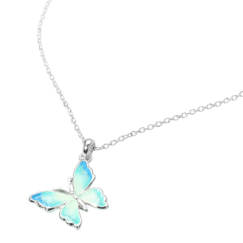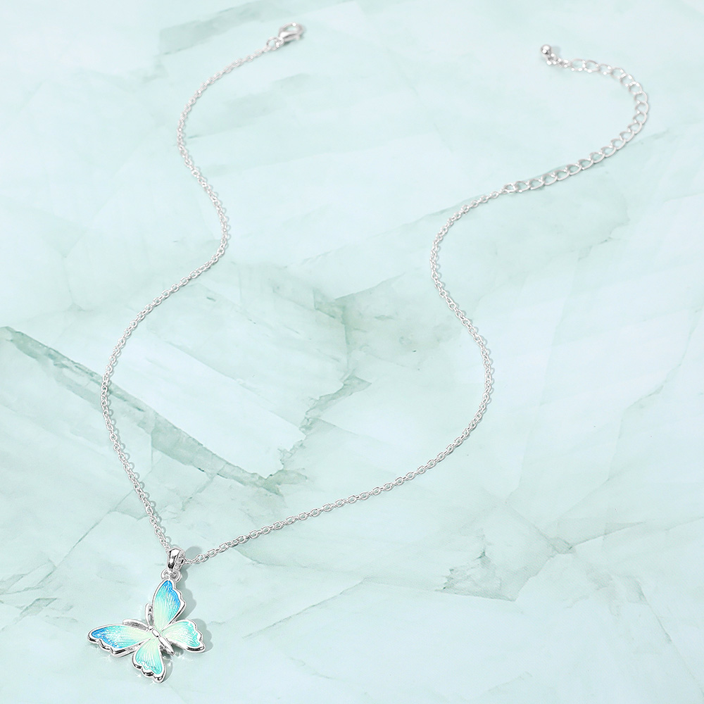 Details • Necklace Size : 16" + 3.5" L • Pendant Size : 1.1" X 1.4" • This butterfly enamel pendant necklace embodies grace and renewal with a delicate wing design in soft, luminous tones. Its elegant craftsmanship and lightweight feel make it perfect for adding a touch of nature-inspired charm to any outfit, from casual wear to special occasions. • Lead and Nickel Compliant