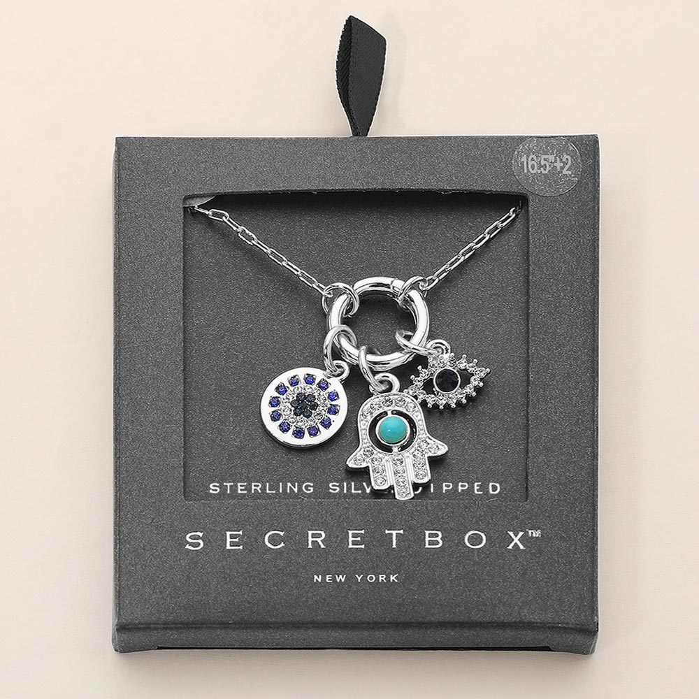 Details • Necklace Size : 16.5" + 2" L • Pendant Size : 1.25" X 1" • A striking multi-charm necklace featuring a protective hand, an eye motif, and a round charm with sparkling accents. The layered symbolic design adds personality and meaning, making it perfect for daily wear, gifting, or styling as a standout statement piece. • Sterling Silver Dipped
