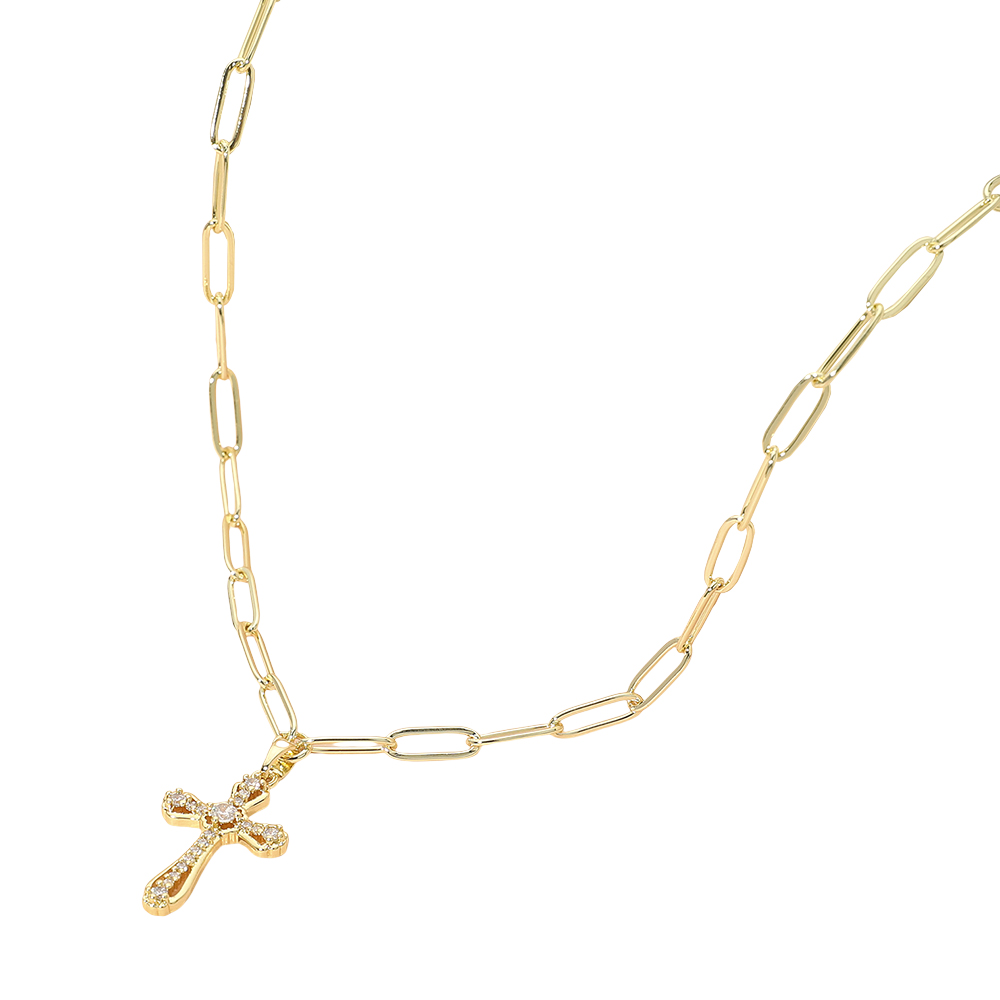 Details • Necklace Size : 15.75" + 2.25"L • Pendant Size : 0.6" X 1.25" • This CZ cross charm paperclip chain necklace features a sleek open-link design paired with a sparkling cross accent for a timeless yet modern look. Perfect for everyday wear, layering, or meaningful gifting, it adds elegant shine and faith-inspired style to boutique jewelry collections. • CZ Cubic Zirconia • Stainless Steel